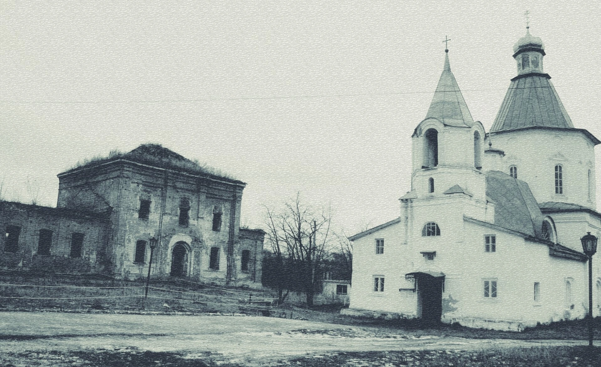 На переднем плане фотографии видно полуразрушенное каменное здание, которое исторически, вероятно, являлось частью церковного комплекса. Это могла быть сторожка, церковно-приходская школа или дом причта, что было обычной практикой для храмовых построек XVIII-XIX веков.