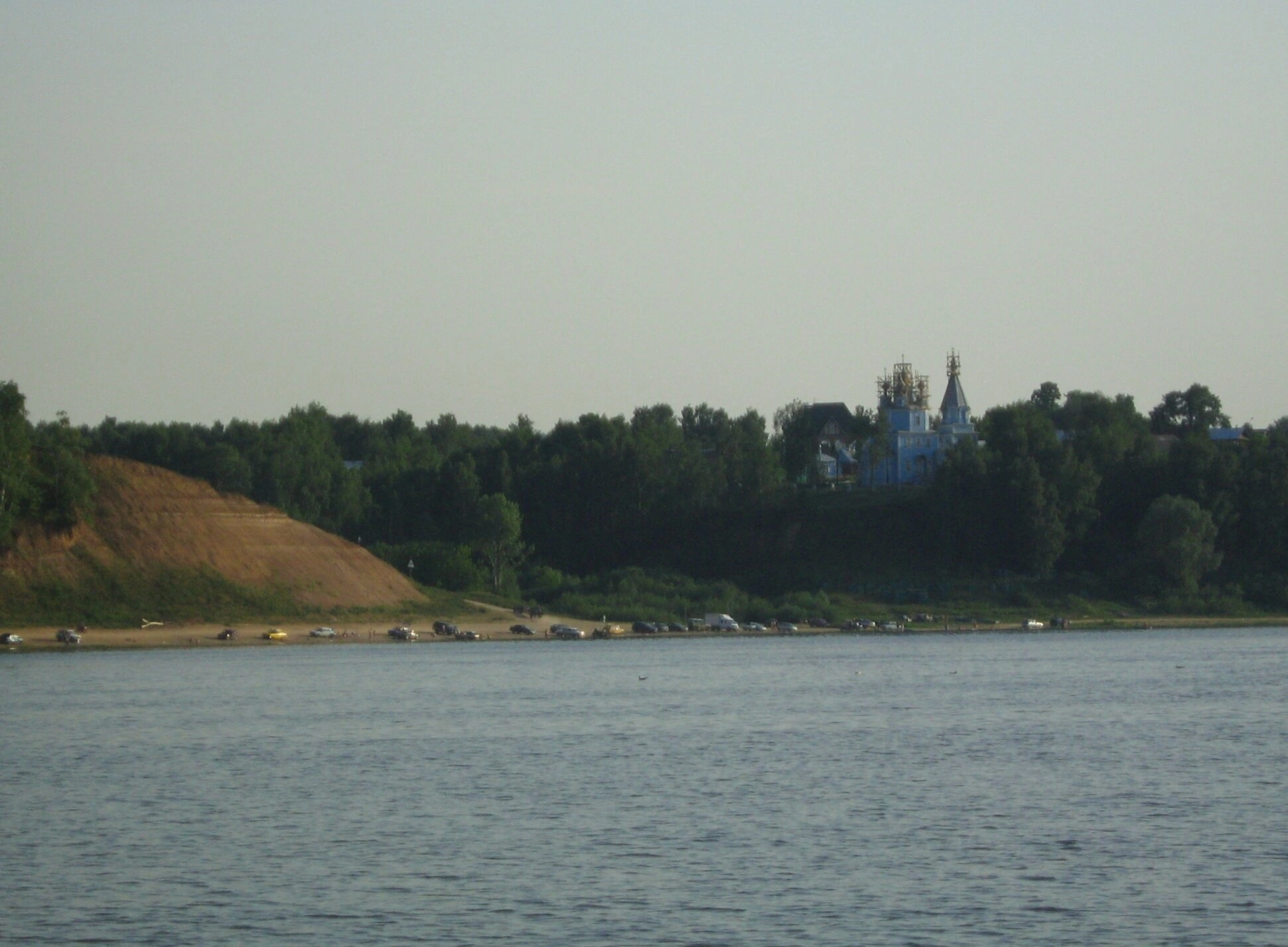 Окружающий храм смешанный лес подчёркивает уединённость и благодатную тишину этого места, делая его притягательным для паломников и ценителей русской духовной культуры. Припаркованные у воды автомобили свидетельствуют о том, что сюда приезжают многочисленные верующие и туристы, желающие поклониться чтимой Казанской иконе Пресвятой Богородицы и насладиться прекрасными видами волжских просторов. Фотография передаёт атмосферу мира, спокойствия и глубокой веры, характерную для этого святого места.