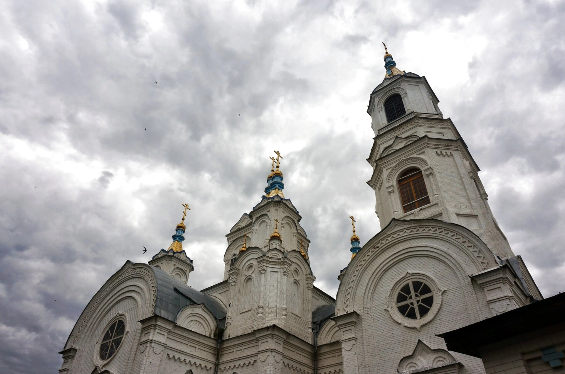 Фотография выполнена в нижнем ракурсе, что позволяет в полной мере оценить монументальность и высоту богоугодного сооружения. Светлые стены храма эффектно контрастируют с драматичным фоном облачного неба, подчёркивая божественную природу этого места. Снимок передаёт не только архитектурные детали, но и особую молитвенную атмосферу, окружающую церковь.