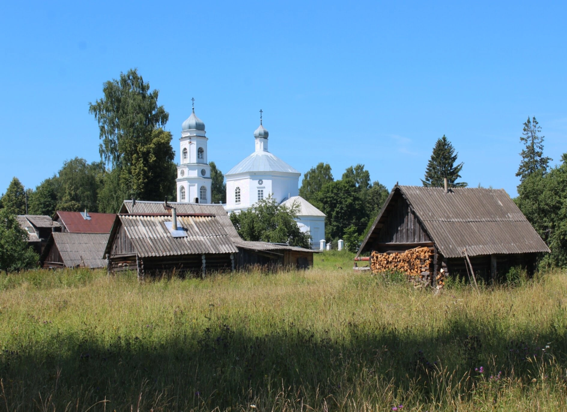 Передний план фотографии погружает зрителя в атмосферу сельской жизни. Высокая трава поля обрамляет старые деревянные постройки, среди которых виден сарай с аккуратно сложенными дровами. Эти хозяйственные детали подчёркивают неразрывную связь храма с повседневной жизнью прихода и местных жителей.