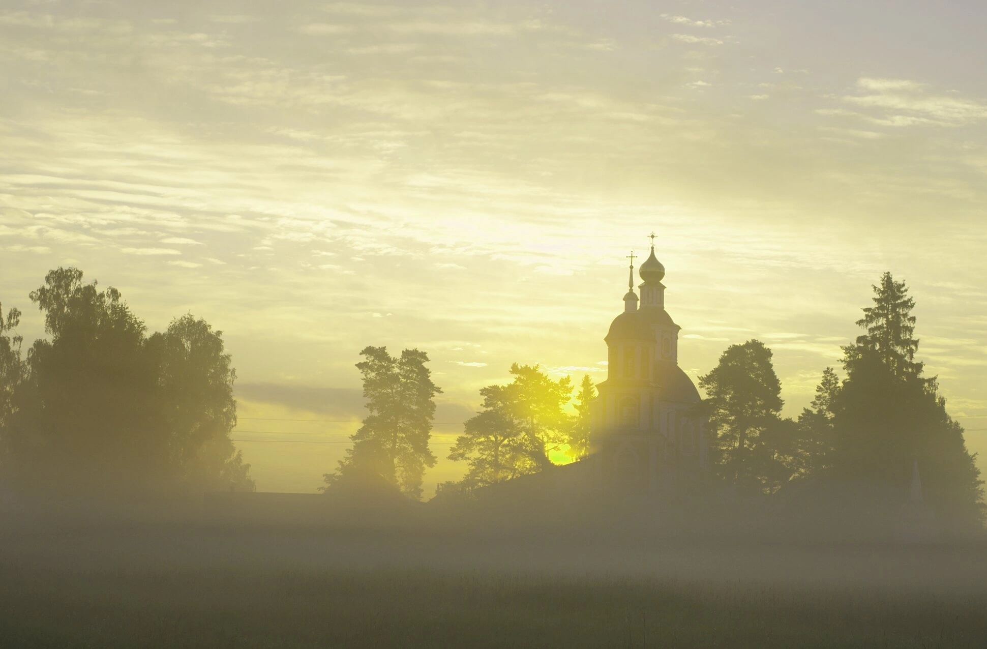 Сквозь дымку мягко проступают светлые стены церкви и сияющие на солнце купола, увенчанные православными крестами. Лучи восходящего солнца, пробивающиеся сквозь облака, озаряют храм неземным светом, подчёркивая его духовную красоту и величие. Этот образ символизирует Божественный свет, проливающийся на верующих и освящающий всё вокруг.
