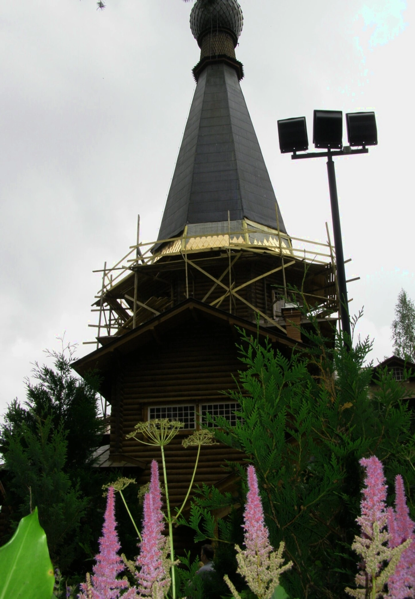 Деревянный храм, возведенный в традициях русского церковного зодчества, представляет собой прекрасный образец шатровой архитектуры. Его венчает изящный луковичный купол, установленный на высоком восьмерике, что символизирует стремление верующих к горнему миру. На момент совершения съемки храм находился на этапе проведения реставрационных работ, о чем явственно свидетельствуют установленные строительные леса вокруг купола и верхней части здания.