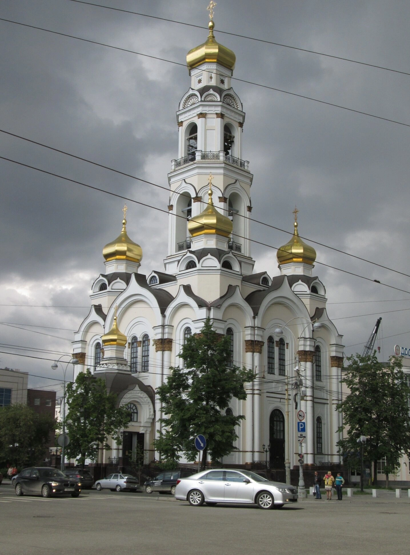 На снимке храм предстаёт в своей красоте, гармонично вписанный в современный городской ландшафт. Его светлый лик и златоглавие сияют под небом, призывая горожан и гостей города к молитве и благочестию. Окружающая храм городская суета с дорогами и пешеходами лишь подчёркивает его духовную высоту и неземное предназначение как дома молитвы и тихой пристани для человеческой души.