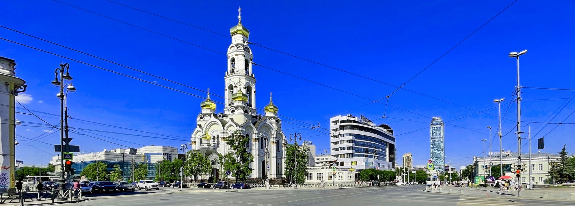 На фотографии запечатлён воссозданный храм-колокольня во имя святого Иоанна Златоуста, известный в народе как Большой Златоуст. Это величественное сооружение dominates панораме исторического центра Екатеринбурга, располагаясь на площади Малышева. Высота колокольни составляет семьдесят семь метров, что делает её одной из самых высоких православных построек на Урале.