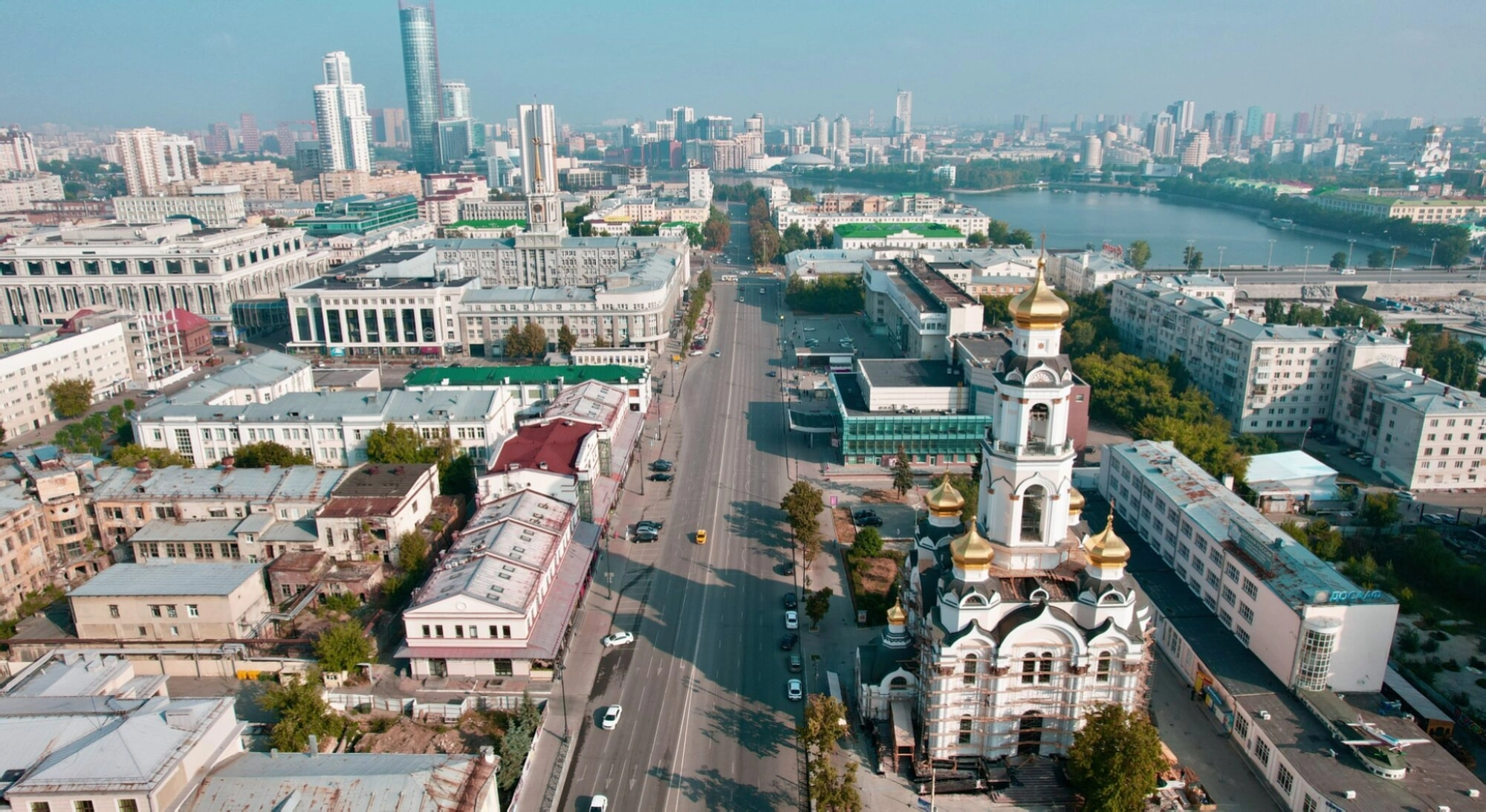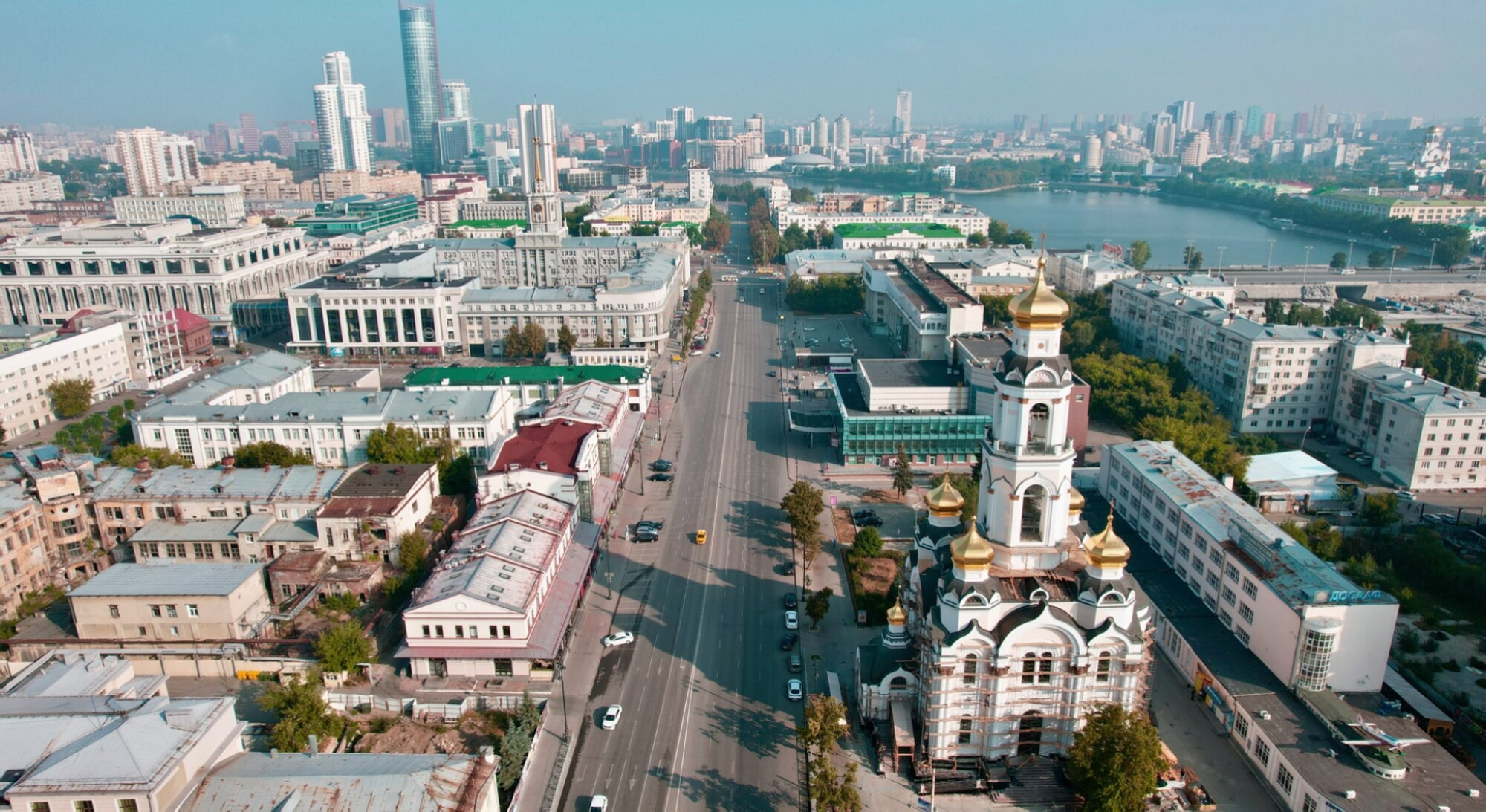 На представленной фотографии запечатлён величественный храм-колокольня во имя Святителя Иоанна Златоуста, известный в народе как Большой Златоуст. Святыня располагается в историческом центре Екатеринбурга, на улице Восьмого Марта. Снимок выполнен с высоты птичьего полёта, что позволяет в полной мере оценить монументальность архитектурного сооружения и его гармоничное вписывание в городской ландшафт.