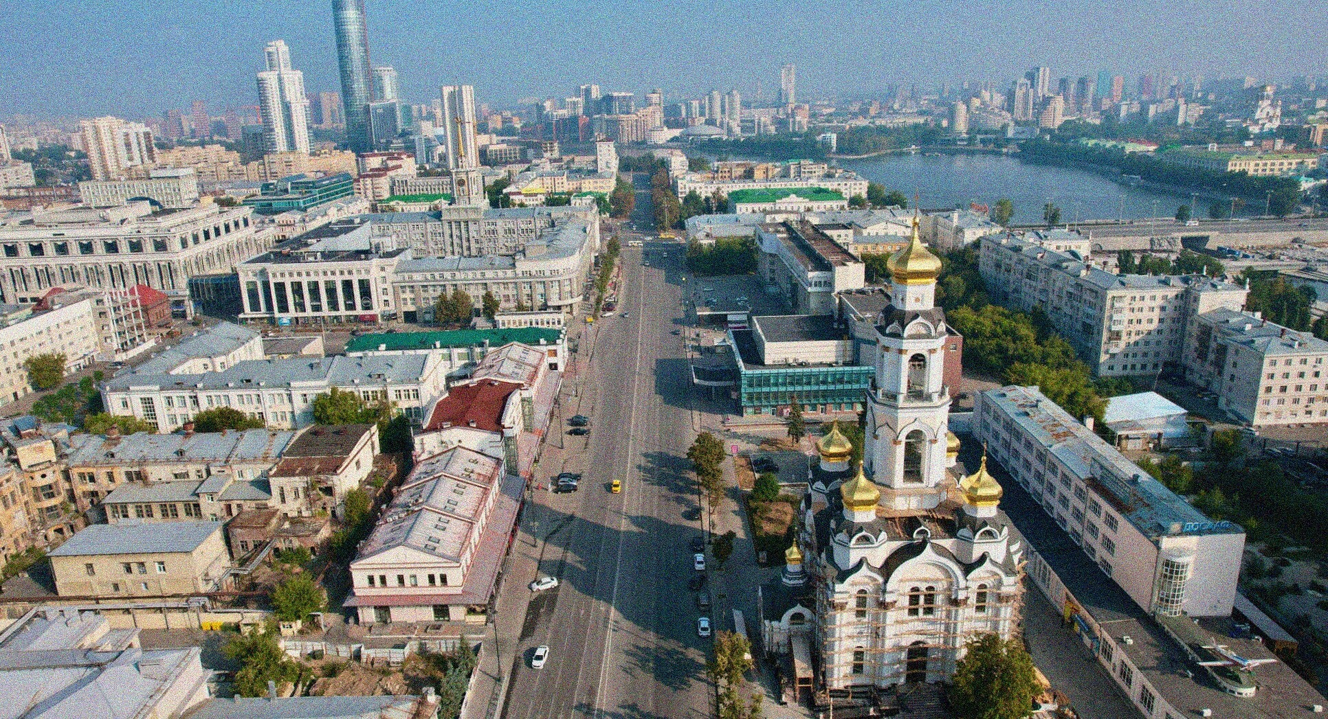 За церковной колокольней простирается динамичная жизнь современного мегаполиса: движение автомобилей по улице Толмачёва, жилые и деловые здания. На заднем плане открывается вид на гладь реки Исеть и городской пруд, а также силуэты новой высотной застройки, что подчёркивает уникальное сочетание исторического наследия и современности в облике уральской столицы.