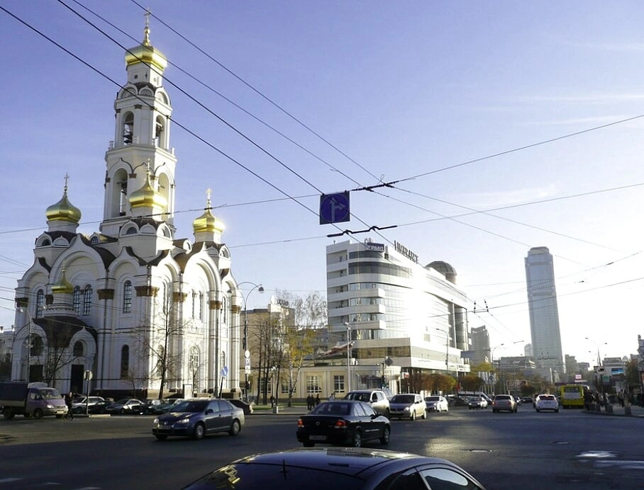На фотографии запечатлён величественный храм-колокольня «Большой Златоуст», расположенный в историческом центре Екатеринбурга, на перекрёстке улиц Малышева и 8 Марта. Его ослепительно белые стены и сияющие золотые купола, устремлённые в небо, создают яркий контраст с окружающим современным городским пейзажем, символизируя неразрывную связь истории и настоящего.