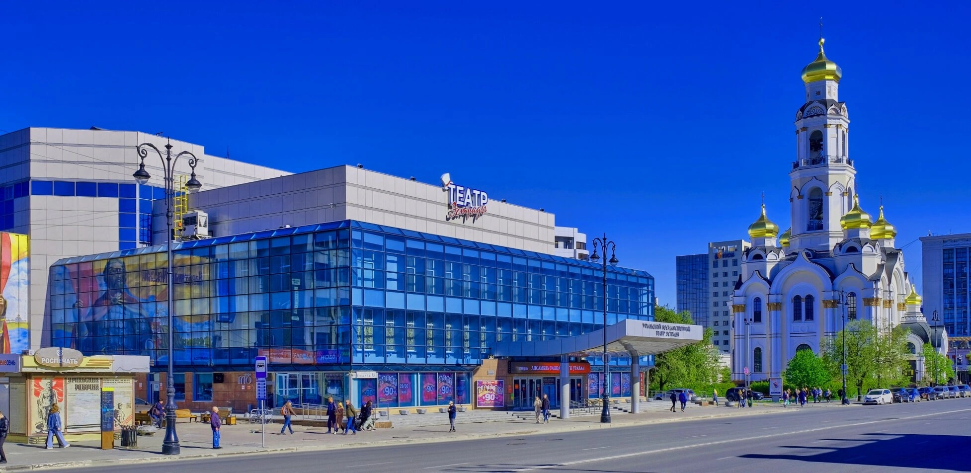 На фотографии запечатлён величественный храм-колокольня «Большой Златоуст», расположенный в самом сердце Екатеринбурга, на пересечении улицы Малышева и 8 Марта. Этот православный храм, освящённый в честь святителя Иоанна Златоуста, представляет собой монументальное сооружение высотой 77 метров, которое до Революции являлось самым высоким зданием во всём Уральском регионе.