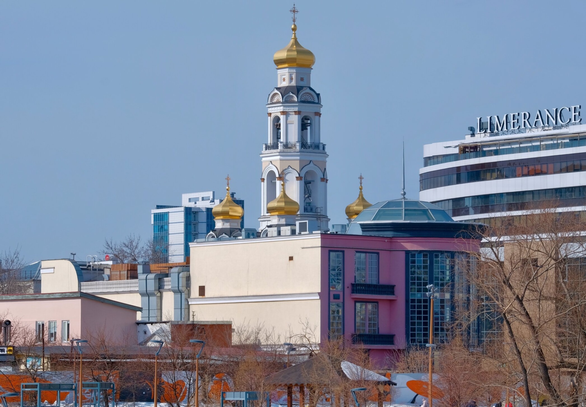 На фотографии запечатлён величественный храм-колокольня во имя святителя Иоанна Златоуста, известный в народе как Большой Златоуст. Это один из самых узнаваемых и значимых православных символов Екатеринбурга, воссозданный на своем историческом месте в начале XXI века.
