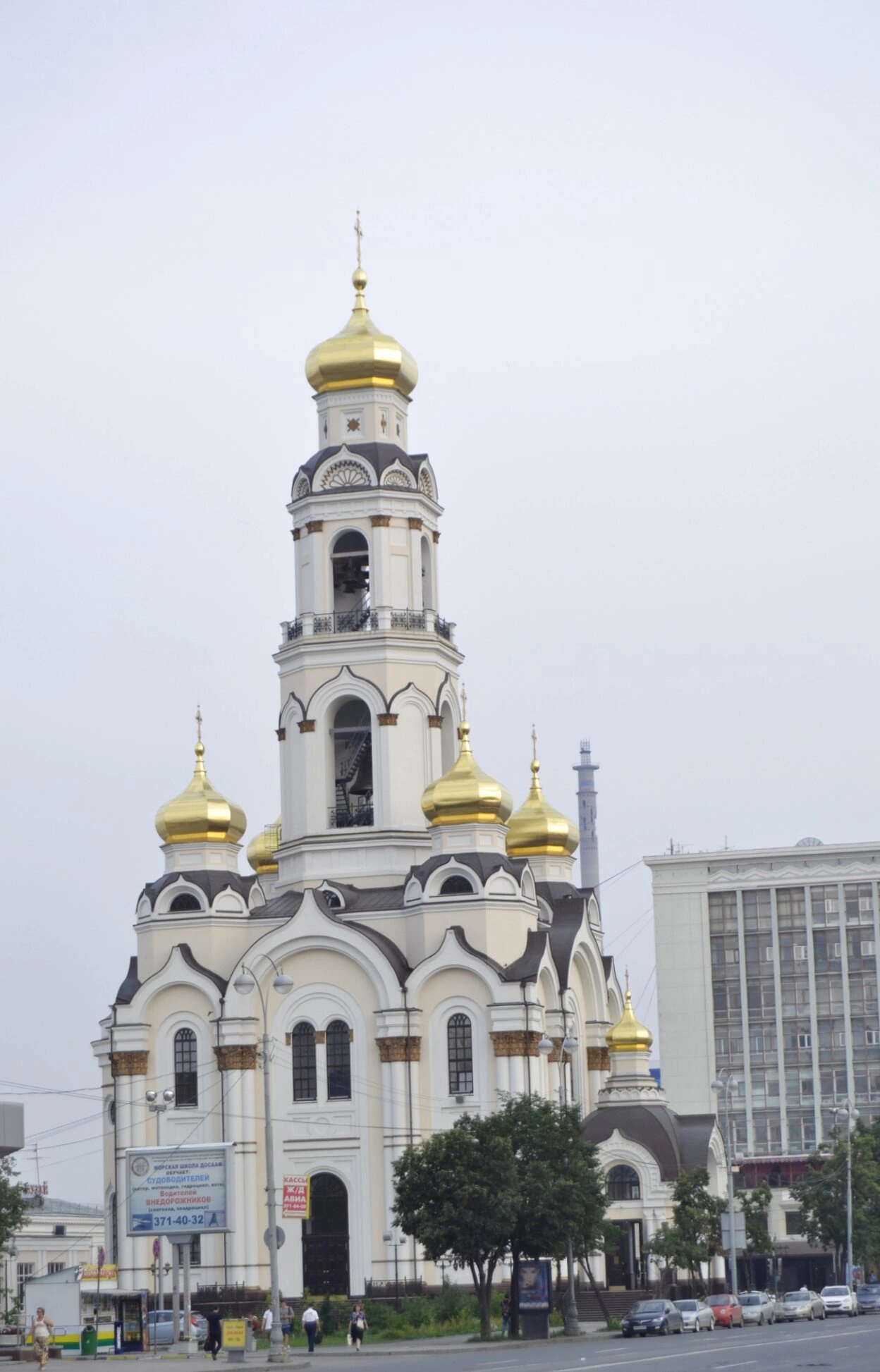 На представленной фотографии запечатлён воссозданный храм-колокольня «Большой Златоуст», также известный как Церковь Сошествия Святого Духа, который располагается в самом сердце Екатеринбурга. Это величественное сооружение, возрождённое на историческом месте, является одним из духовных символов города и всей Уральской земли.