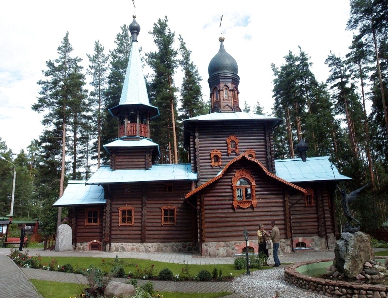 На представленной фотографии запечатлен деревянный храм в честь Коневской иконы Божией Матери, расположенный в поселке Саперное Приозерского района Ленинградской области. Святыня находится в живописной местности на берегу Бухарского озера, что придает ей особую умиротворенность и благолепие.
