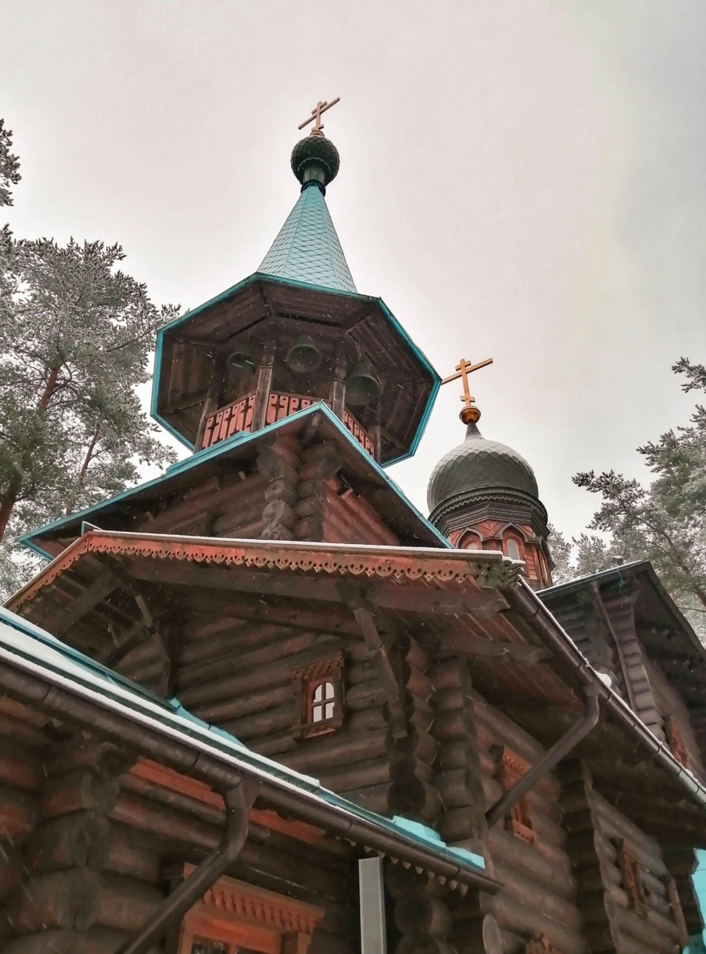 На фотографии запечатлен храм в честь Коневской иконы Божией Матери, расположенный в поселке Саперное Приозерского района Ленинградской области. Эта деревянная церковь является одним из значимых духовных центров Карельского перешейка и местом особого почитания чудотворного образа Пресвятой Богородицы.
