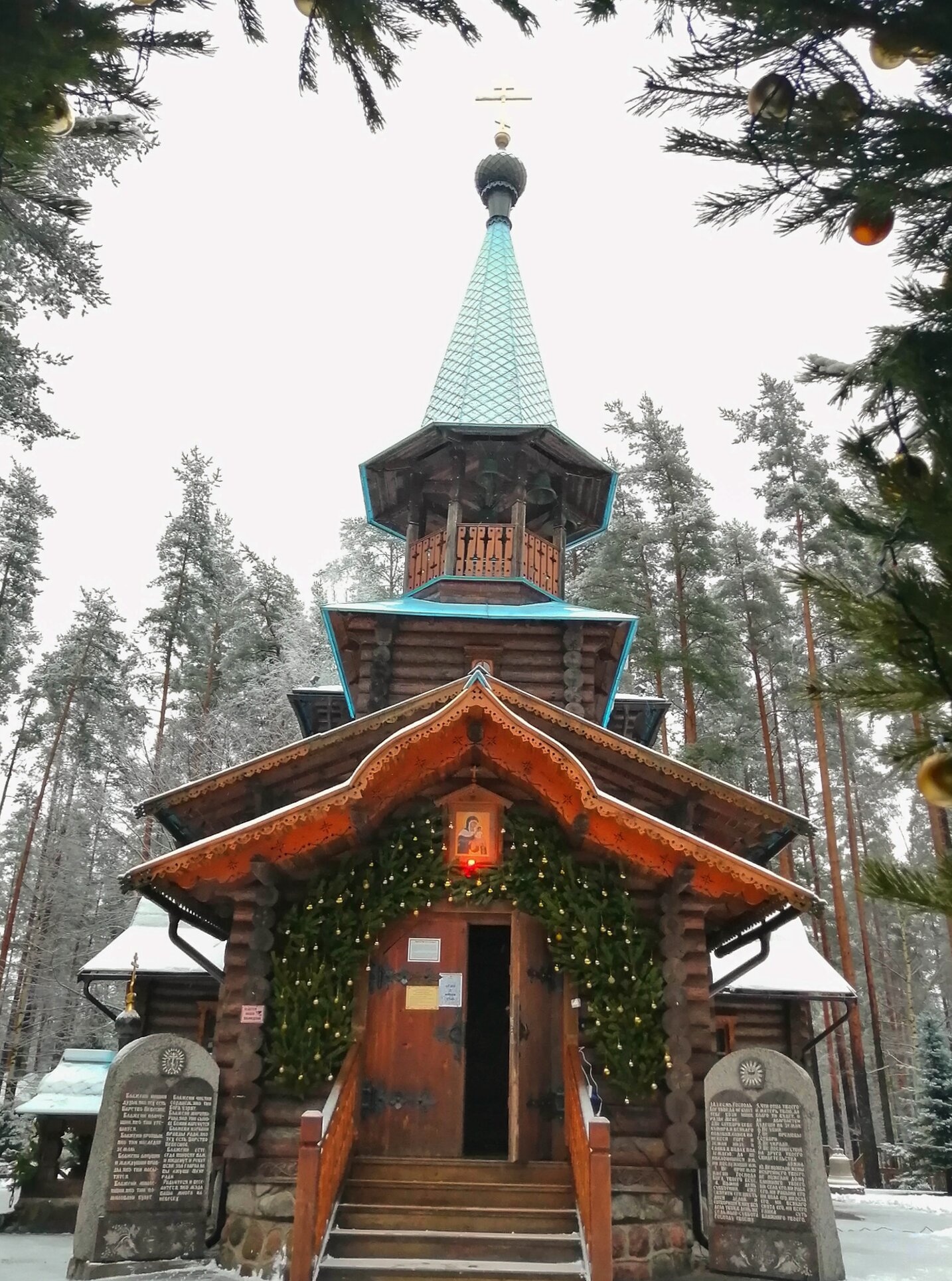 На представленной фотографии запечатлена деревянная церковь в честь Коневской иконы Божией Матери, расположенная в поселке Саперное Приозерского района Ленинградской области. Святыня возведена в традициях русского северного деревянного зодчества и освящена в память о чудотворном образе Пресвятой Богородицы, явленном на острове Коневец в Ладожском озере.