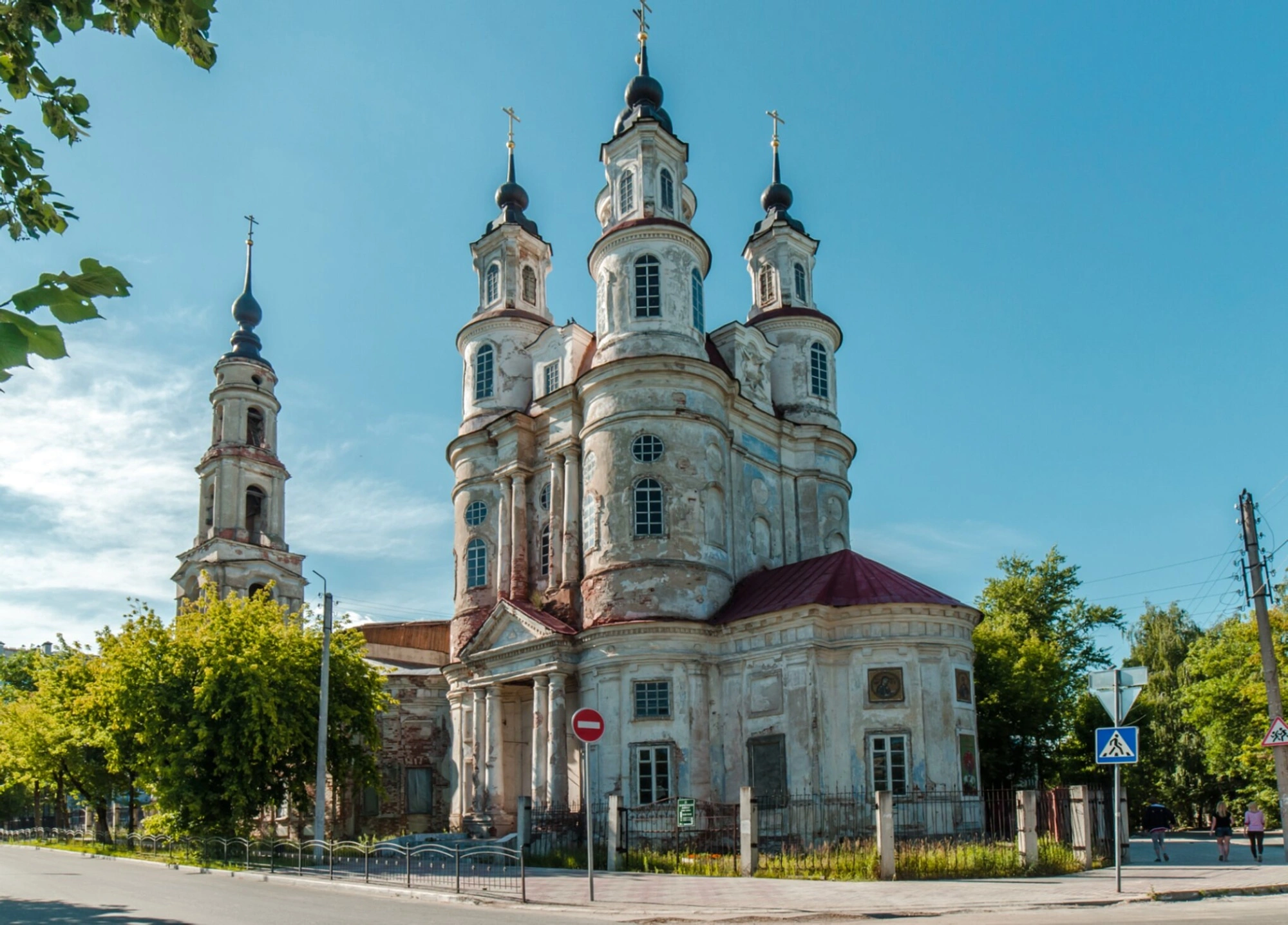 На фотографии храм предстаёт в своём великолепии, окружённый зеленью деревьев. Его устремлённые в небо купола и яркий барочный декор создают яркий архитектурный акцент в городской среде, напоминая о глубоких православных традициях калужской земли.