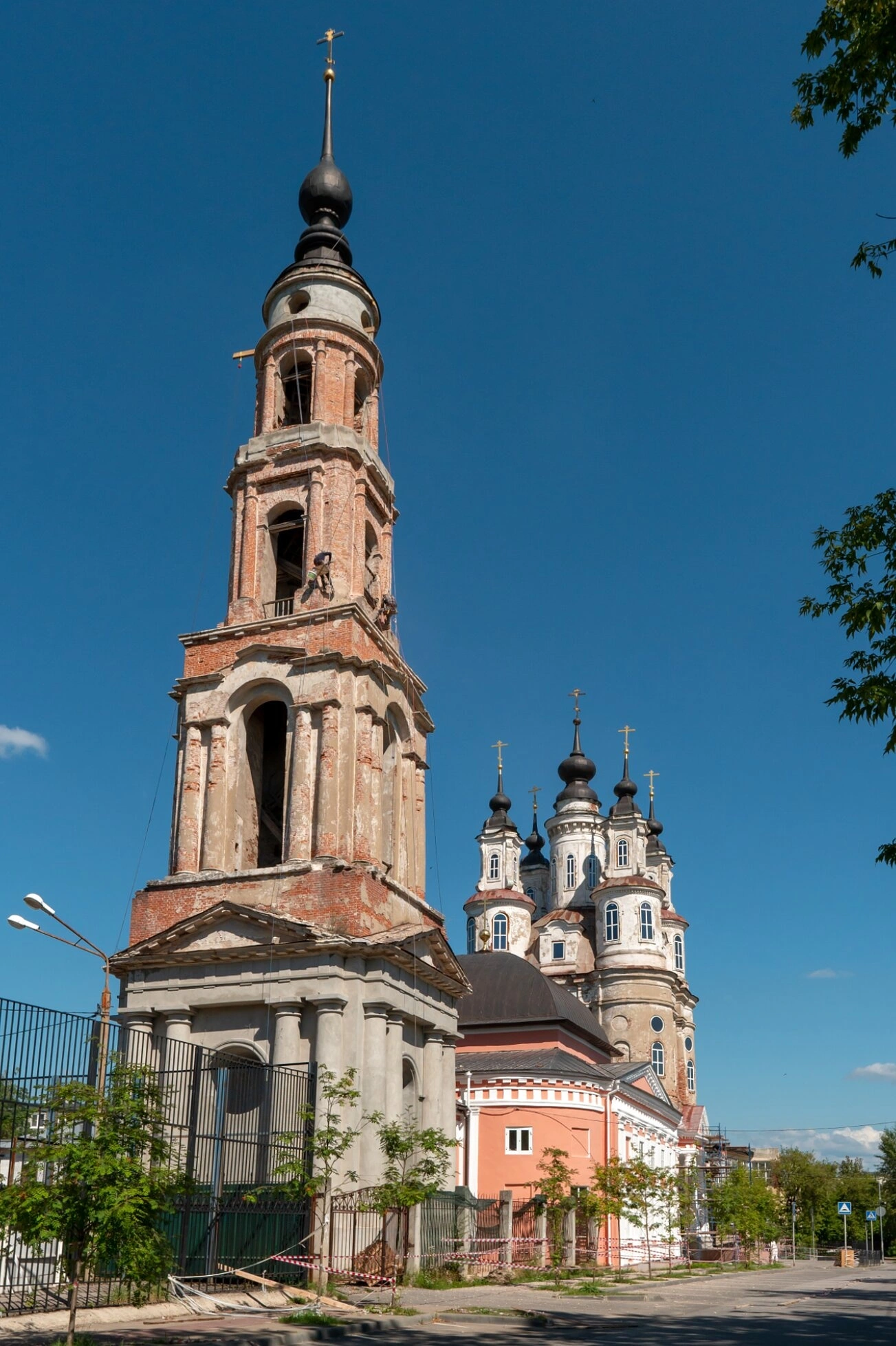 На представленной фотографии запечатлён величественный православный храм в честь святых бессребреников и чудотворцев Космы и Дамиана, что располагается в историческом центре города Калуги. Этот каменный собор, освящённый также в честь Нерукотворного Образа Спасителя, является выдающимся памятником церковной архитектуры конца XVIII столетия и объектом культурного наследия.