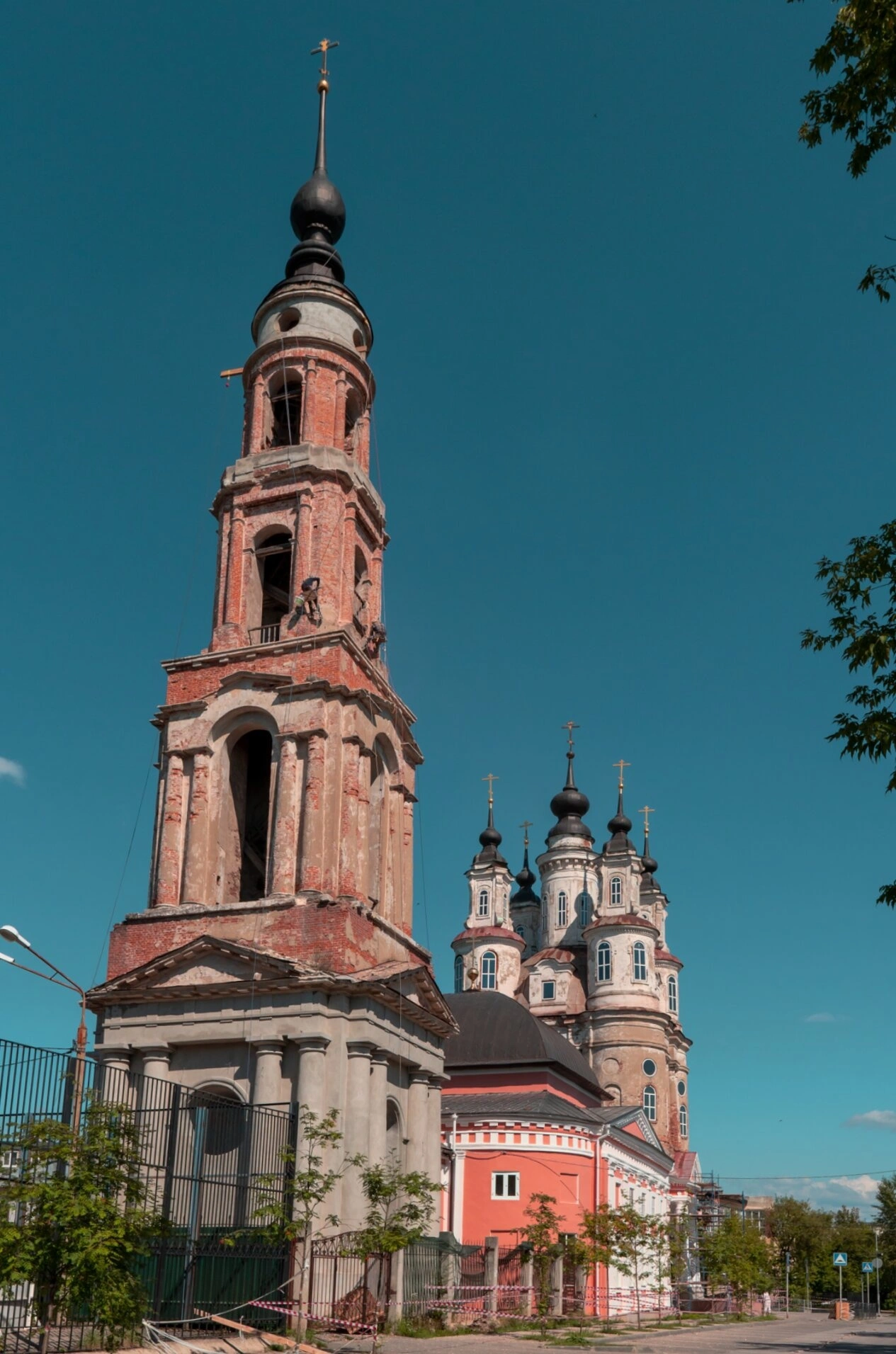 На представленной фотографии запечатлён величественный православный храм во имя святых мучеников и бессребреников Космы и Дамиана Римских, расположенный в историческом центре города Калуги. Этот старинный храм является ярким памятником церковной архитектуры и духовным центром, привлекающим как паломников, так и ценителей русского зодчества.