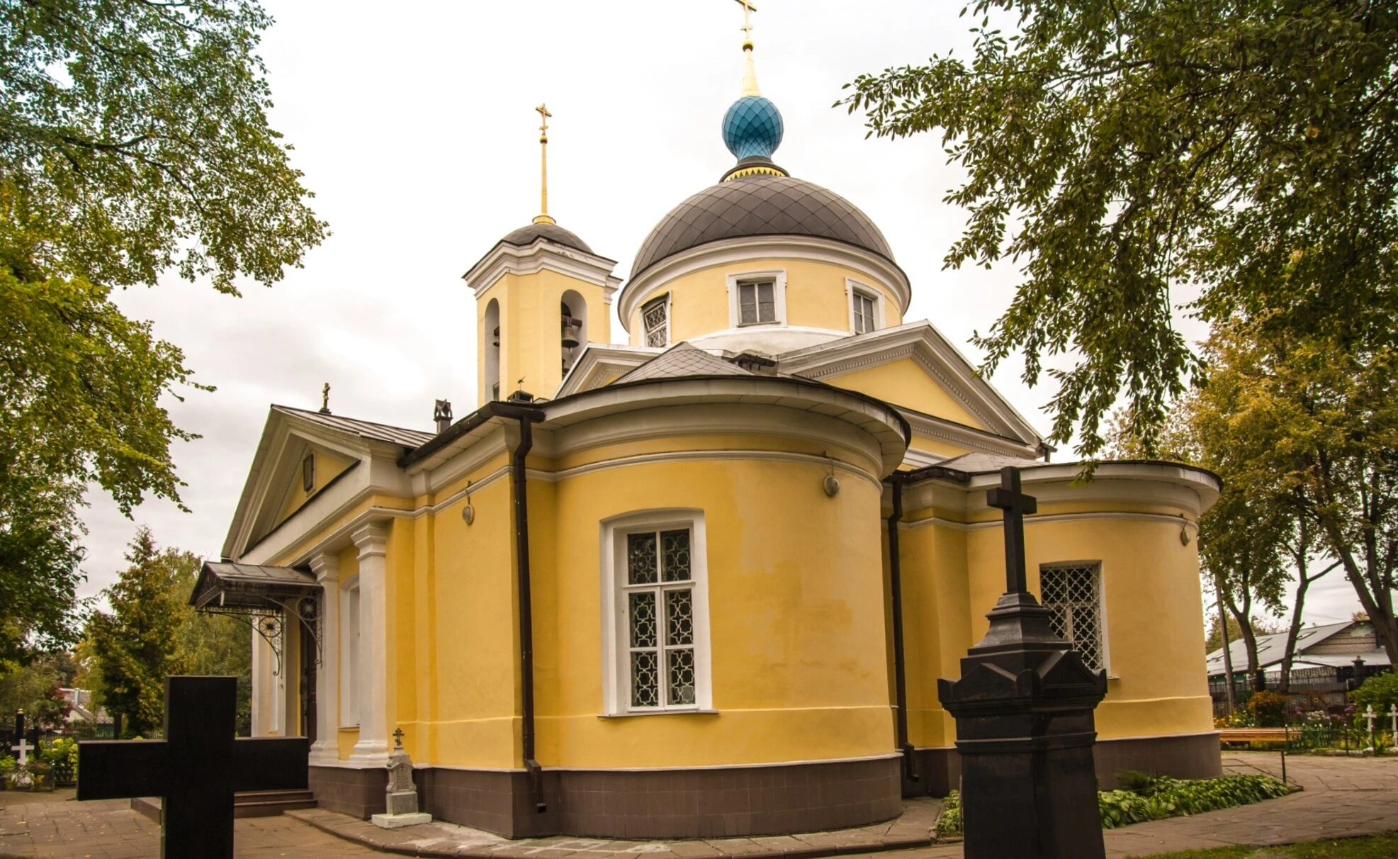 Особого внимания заслуживает окружающая храм территория. Церковь окружена деревьями с золотистой осенней листвой, создающей особую атмосферу духовного умиротворения. На переднем плане виднеются христианские надгробия и памятные кресты, свидетельствующие о наличии церковного кладбища – традиционного для многих православных приходов.