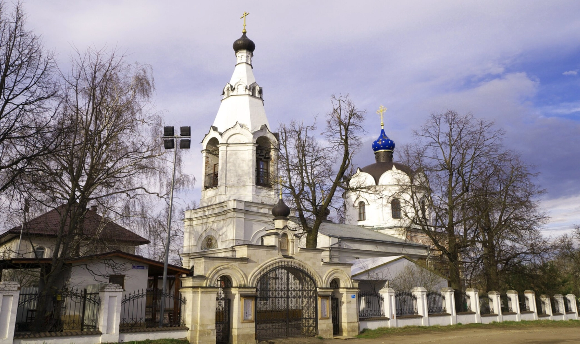 На представленной фотографии запечатлён храм в честь святых бессребреников и чудотворцев Космы и Дамиана, расположенный в селе Меткино Московской области. Святыня является значимым памятником церковной архитектуры и духовным центром для православных верующих.