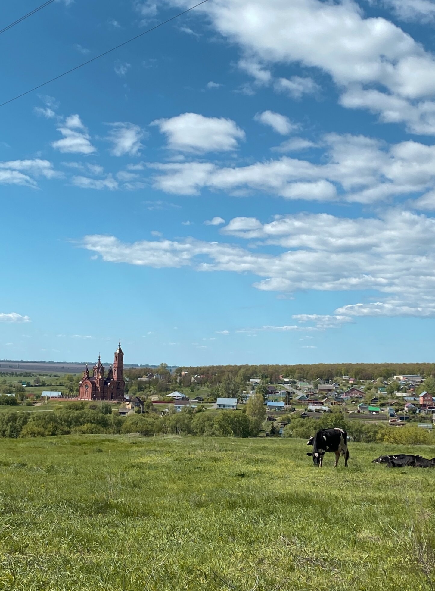 На представленной фотографии запечатлён живописный сельский пейзаж с храмом в честь святых бессребреников и чудотворцев Космы и Дамиана, расположенным в селе Мусорка Ставропольского района Самарской области. На переднем плане изображения простирается зелёное пастбище, где мирно пасутся коровы, что символизирует традиционный уклад сельской жизни, неразрывно связанный с духовными основами.