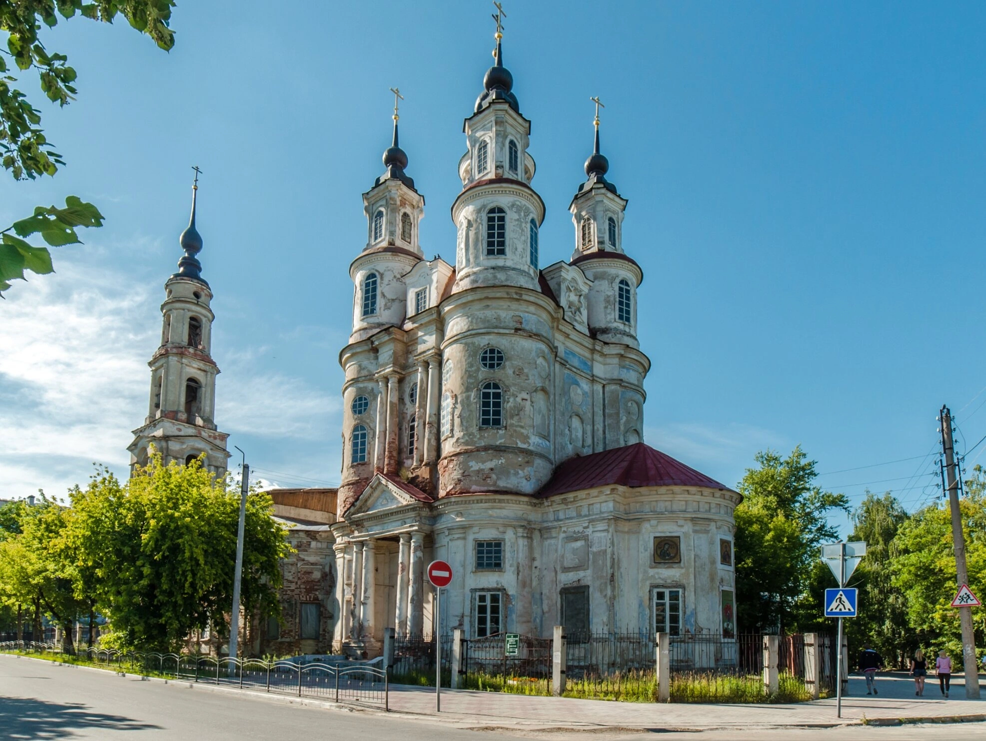 На представленной фотографии запечатлён храм в честь святых бессребреников и чудотворцев Космы и Дамиана Римских, что располагается в историческом районе Ямская слобода города Калуги. Святыня, возведённая в 1794 году, является выдающимся памятником церковной архитектуры периода барокко и объектом культурного наследия.