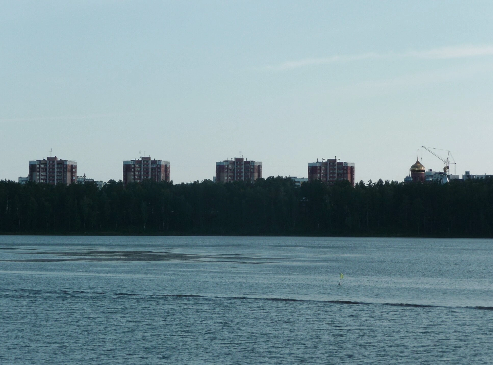 На фотографии запечатлён живописный вид на Кантатское водохранилище в городе Железногорске Красноярского края. На переднем плане изображена спокойная водная гладь, отражающая небесную лазурь. Противоположный берег водоёма густо порос деревьями, создавая естественную природную рамку для городского пейзажа.