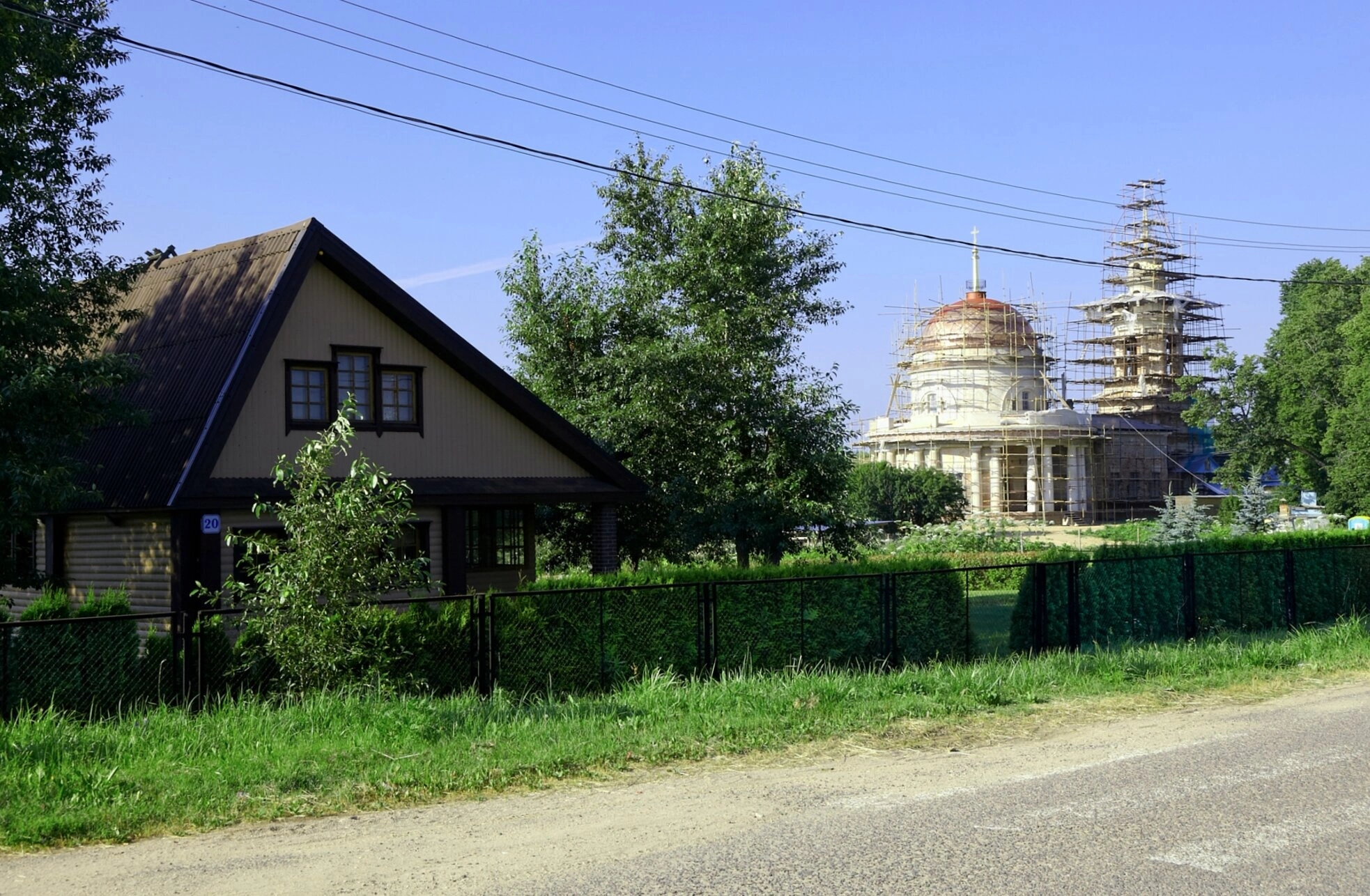 На представленной фотографии запечатлён живописный вид на храм Михаила Архангела, что расположен в селе Архангельское Московской области. На переднем плане композиции находится двухэтажный жилой дом под двускатной крышей, окружённый зелёными кустарниками и деревянным забором. От него взгляд естественно переходит к главному объекту снимка — восстанавливаемой церкви.