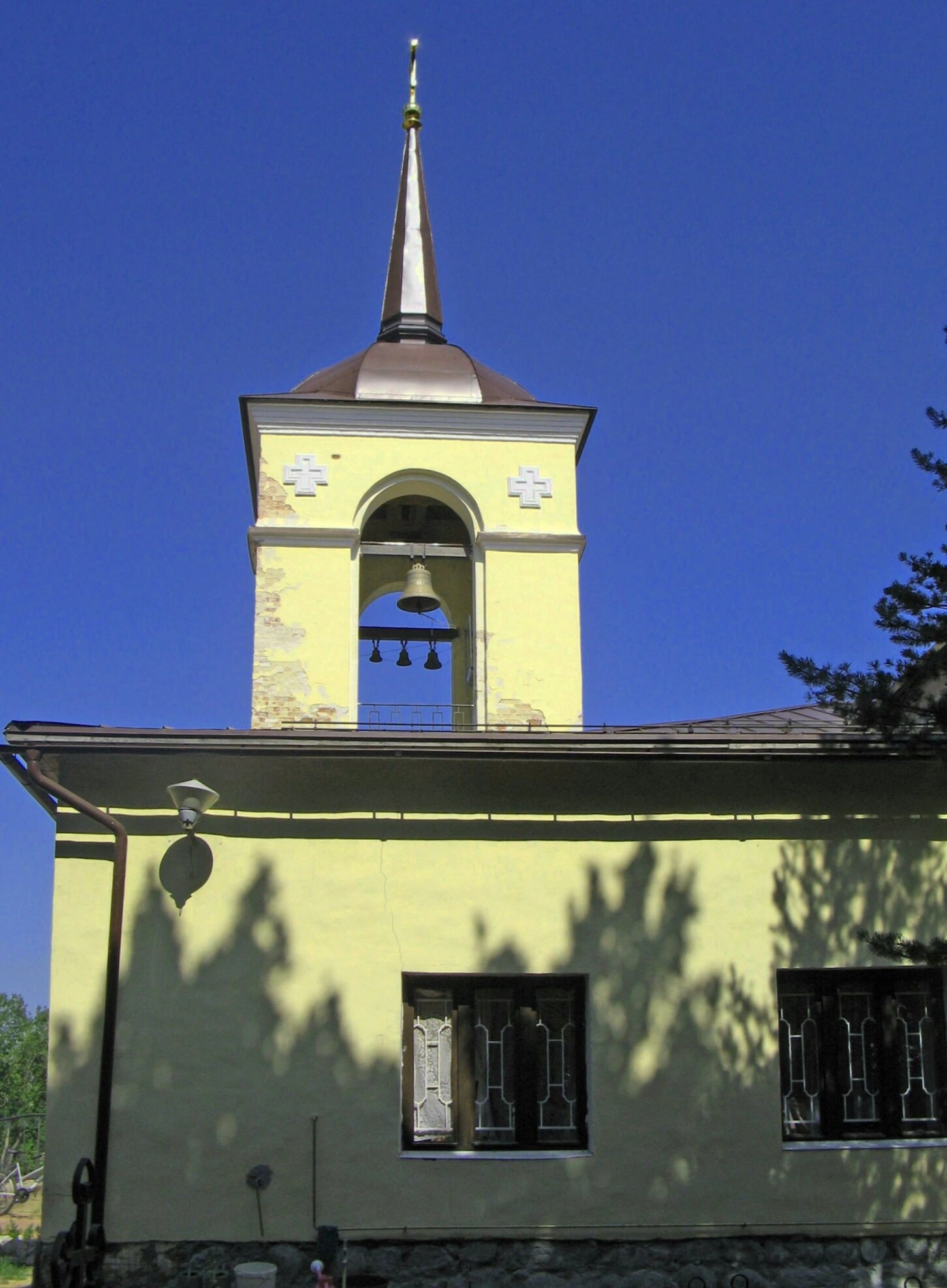 Ниже располагается фасад самого храмового здания, выдержанный в едином цветовом решении с колокольней. Его стену прорезают два оконных проёма, защищённые коваными решётками. На фасаде играют лёгкие тени от ветвей деревьев, растущих справа от церкви, что придаёт изображению особую живость и одухотворённость.