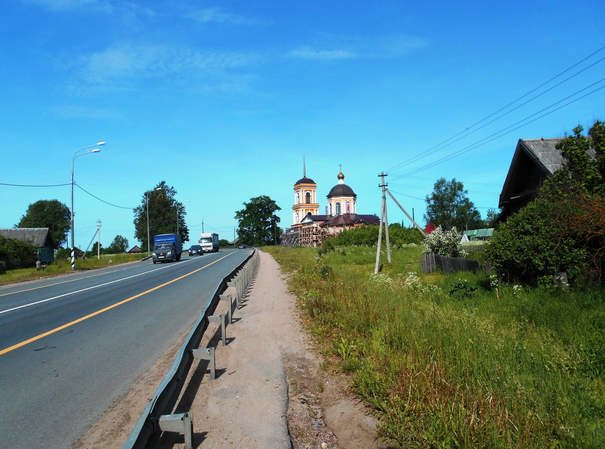 На представленной фотографии запечатлён живописный вид деревни Хотилово в Бологовском районе Тверской области. На переднем плане проходит автомобильная дорога, вдоль которой установлен металлический отбойник. Справа от асфальтированного полотна видна грунтовая тропа, поросшая летней травой.