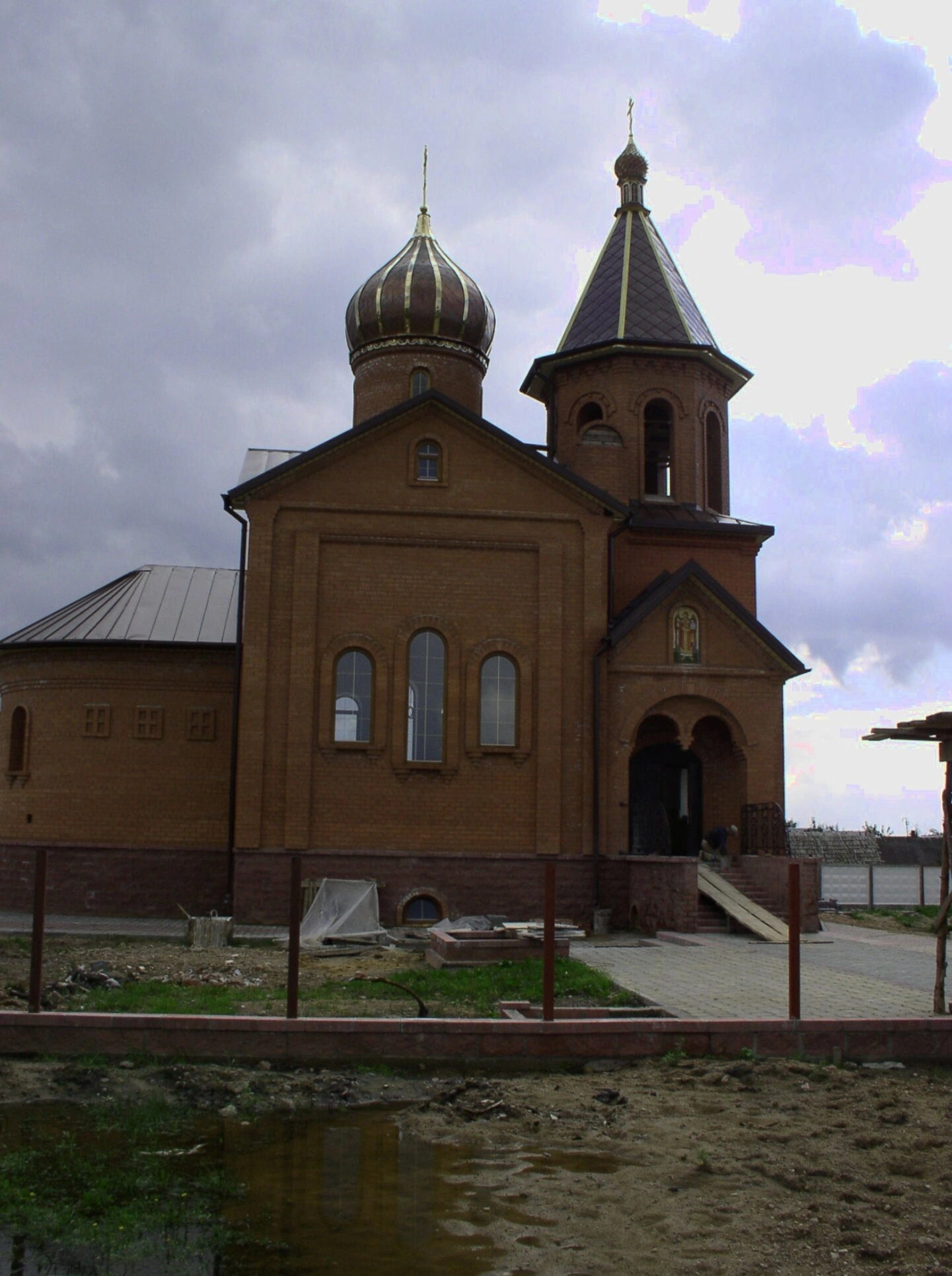 На момент съёмки территория вокруг храма находилась в процессе благоустройства, что видно по элементам ограждения и грунтовой дороге. Лужа на переднем плане, отражающая пасмурное небо, свидетельствует о недавно прошедшем дожде, добавляя снимку особую атмосферу умиротворения и духовной чистоты. Этот храм является не только архитектурной доминантой населённого пункта, но и важным духовным центром для православных верующих всего региона.