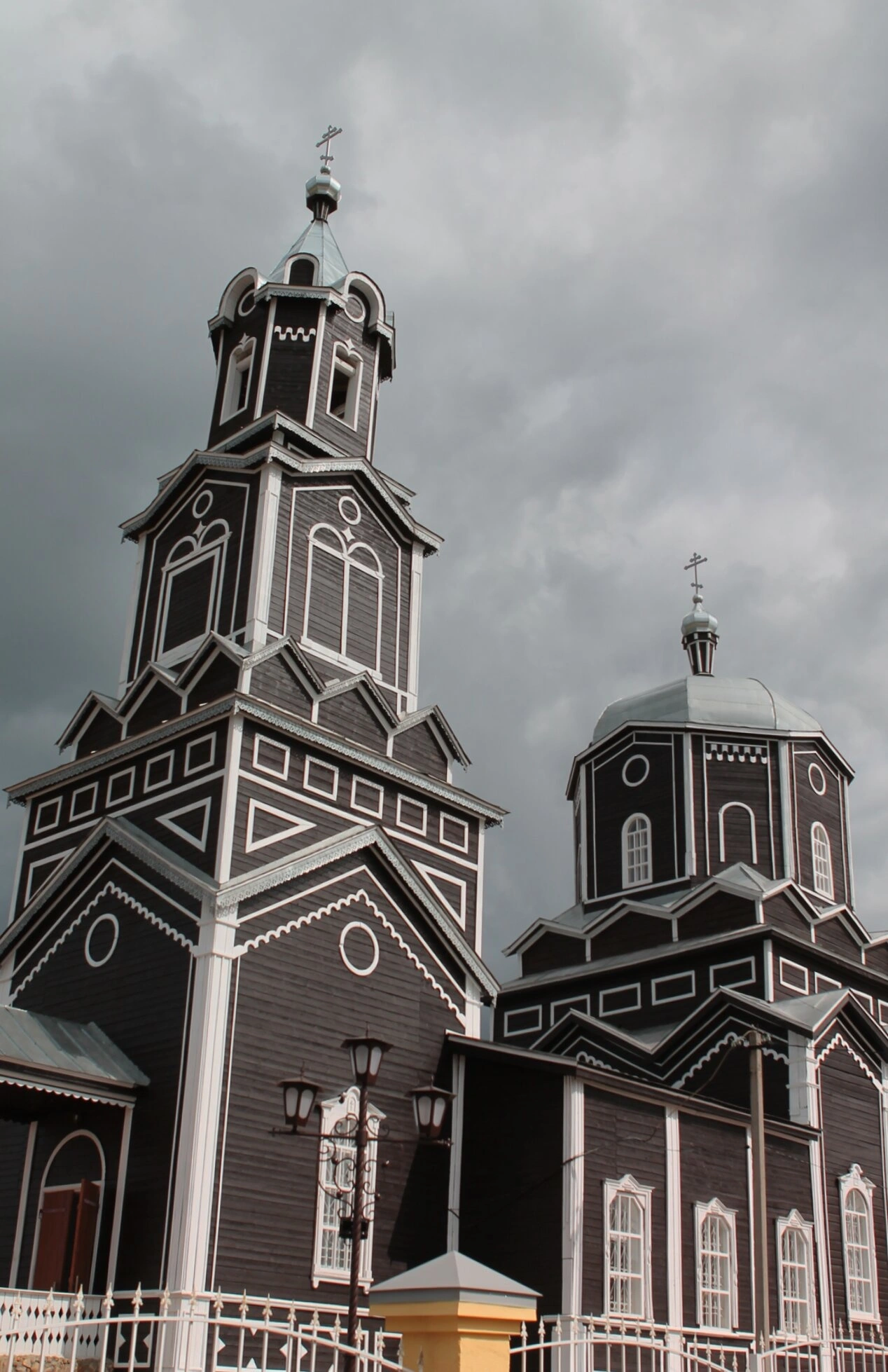 На снимке прекрасно видна величественная многоярусная колокольня, увенчанная луковичной главкой с водружённым на неё православным крестом. Рядом располагается основной объём церкви, также завершающийся куполом. Здание целиком срублено из дерева и окрашено в тёмный цвет, что создаёт ощущение благоговейной строгости и древности. Архитектурное убранство фасадов подчёркивается белоснежными декоративными элементами: наличниками, карнизами и пилястрами, которые чётко выделяются на тёмном фоне. В оформлении присутствуют характерные для русского стиля щипцовые фронтоны и круглые оконца-люкарны.