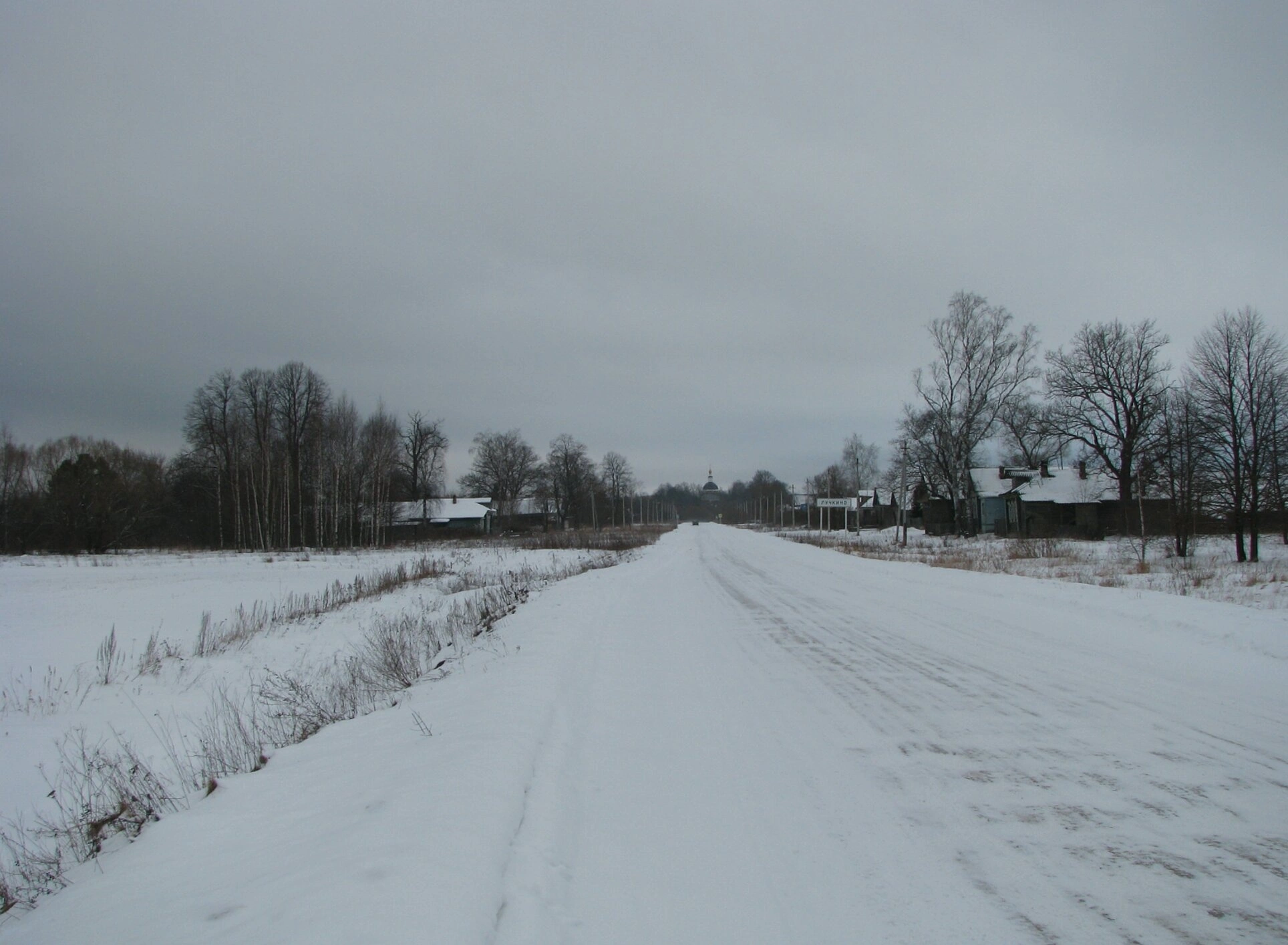 Вдоль дороги возвышаются голые деревья, а среди них виднеются скромные сельские строения. Центром композиции и духовным ориентиром является силуэт старинной церкви с выразительным куполом, завершающимся главкой с крестом. Этот храм, освящённый в честь Архистратига Михаила, является не только архитектурным, но и историческим достоянием края.