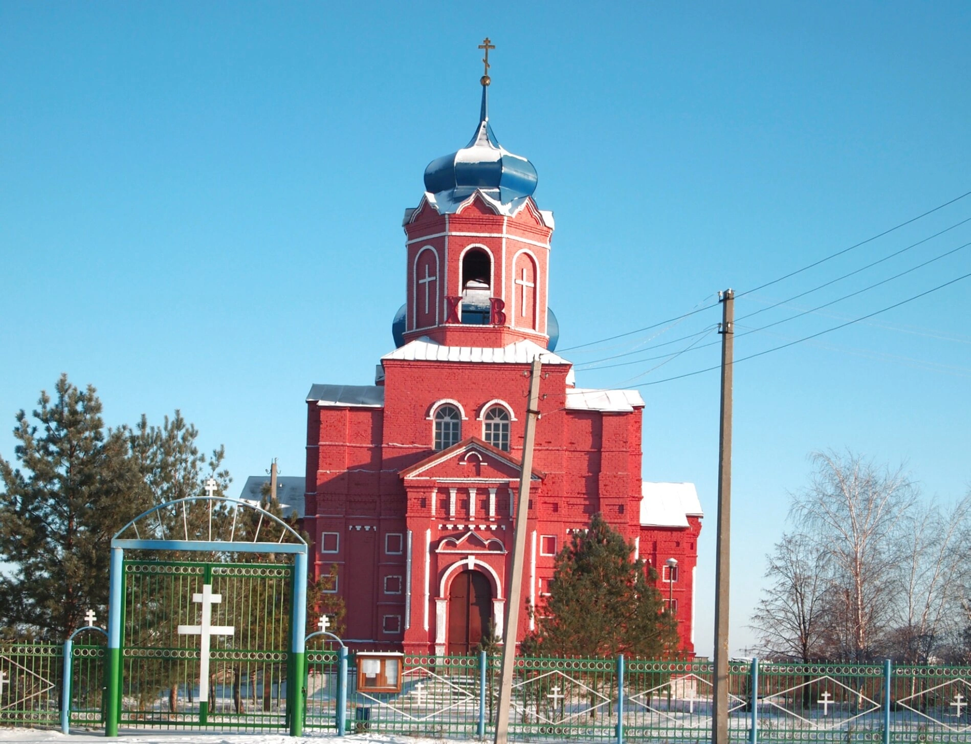 Центральным объектом является каменная церковь, выстроенная из красного кирпича и увенчанная синим луковичным куполом с установленным на нём крестом. Фасад украшен белыми декоративными элементами, обрамляющими оконные проёмы и входную арку. Перед храмом установлен зелёный металлический забор с коваными православными крестами.