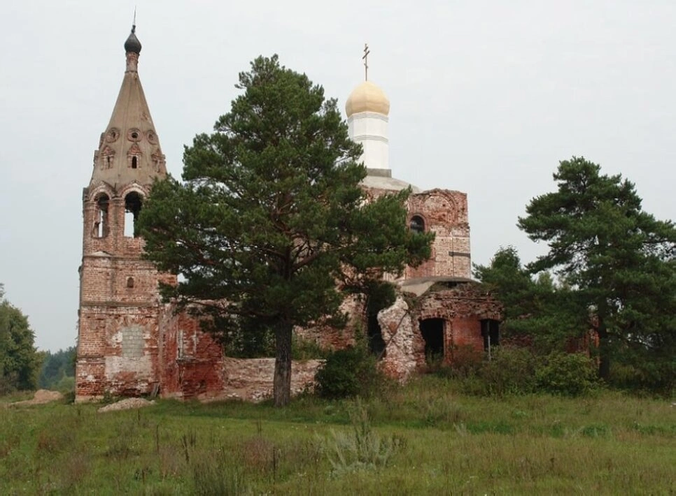 Несмотря на своё плачевное состояние, храм живописно возвышается среди полей и молодой поросли деревьев, напоминая о вечности и необходимости сохранения духовного и исторического наследия. Фотография передаёт атмосферу тихой скорби и надежды на возможное будущее возрождение этой намоленной святыни.