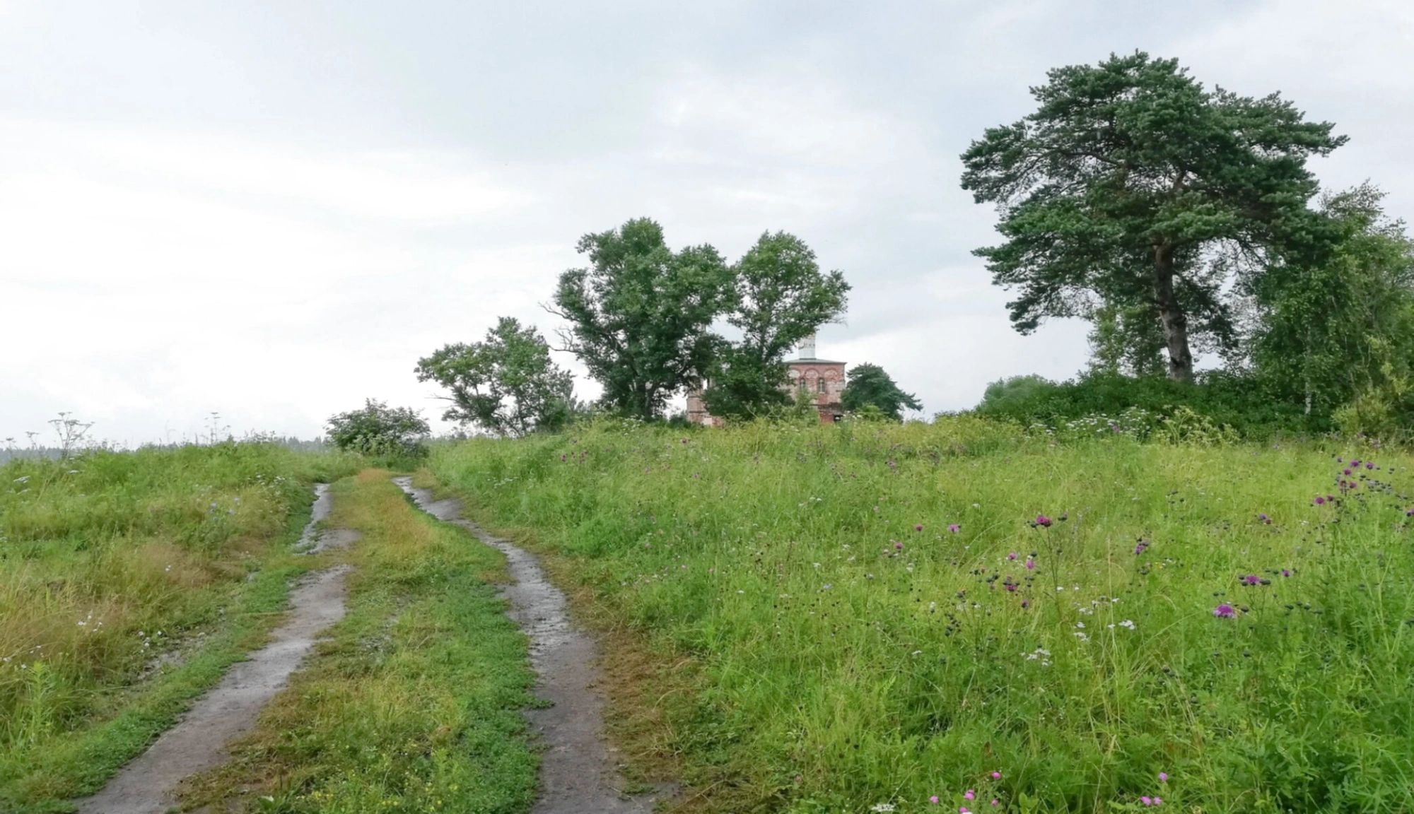На переднем плане изображена грунтовая дорога, уходящая вглубь поля, поросшего высокой травой и полевыми цветами. Этот путь символически ведёт к духовной цели — храму, возвышающемуся на холме. Главный объект фотографии — каменная церковь, построенная в стиле классицизма в первой половине XIX века на средства князей Щербатовых. Её стройный четверик, увенчанный световым барабаном и главкой, и колокольня выделяются на фоне пасмурного неба, создавая возвышенный и величественный образ.