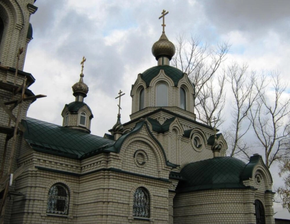 На представленной фотографии запечатлён величественный православный храм во имя святого Архистратига Михаила, расположенный в селе Новоживотинное Рамонского района Воронежской области. Святыня возведена из светлого кирпича и увенчана зелёными куполами, которые символизируют небесную сферу и надежду на спасение. Золочёные кресты, сияющие на солнце, свидетельствуют о победе Христа над смертью.
