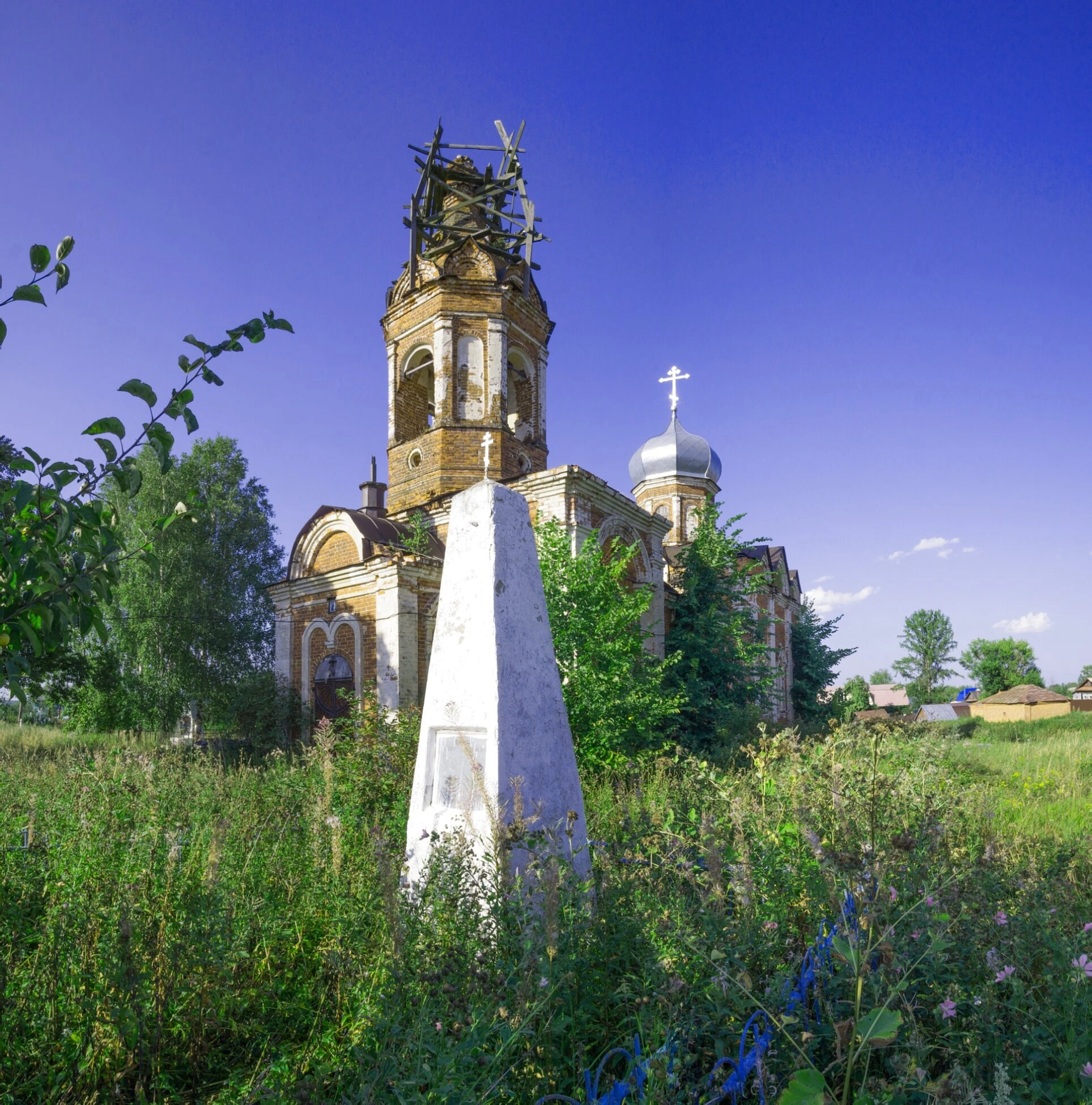 На переднем плане фотографии виден памятный знак или обелиск, чьё назначение требует уточнения, но который неразрывно связан с историей этого святого места. На заднем плане просматриваются деревенские постройки и окружающие село леса, создающие типичный для среднерусской полосы ландшафт.