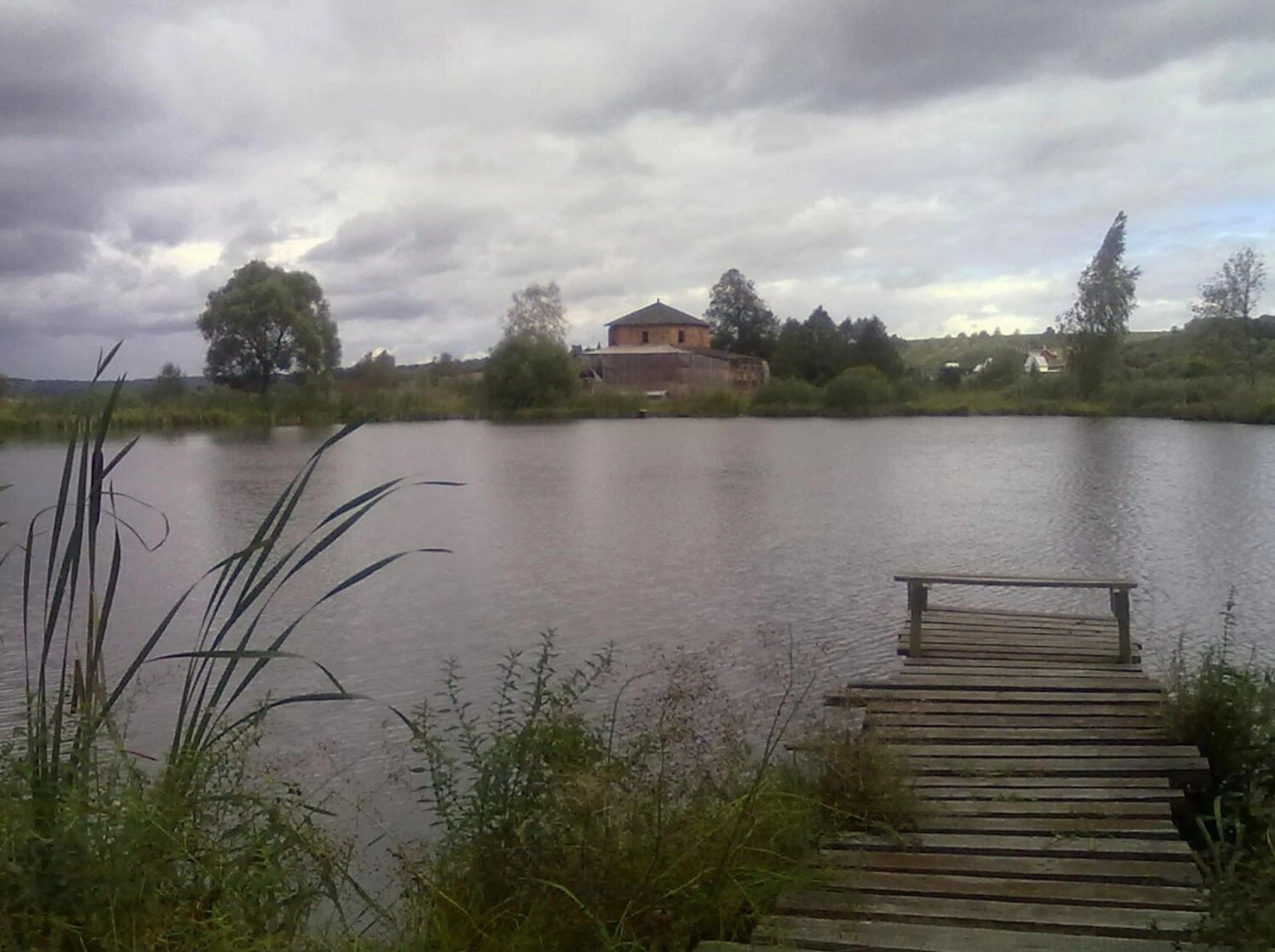 Пейзаж передаёт спокойную и несколько созерцательную атмосферу пасмурного дня. Серые облака, затянувшие небо, мягко рассеивают свет, а водная гладь пруда служит естественным зеркалом для архитектурного облика храма. На переднем плане виднеется деревянный мостик и прибрежная растительность, включая густой камыш, что добавляет композиции глубины и естественности.