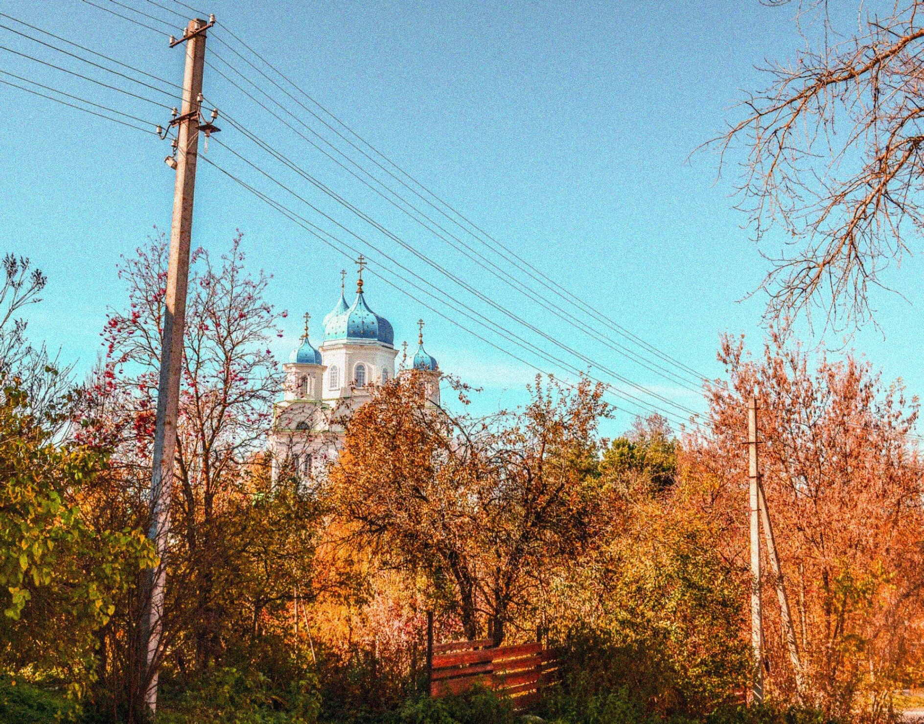 Фотография передаёт особую атмосферу духовного спокойствия и умиротворения, характерную для русской провинции. Деревья с золотистой осенней листвой на переднем плане обрамляют храм, создавая естественное природное обрамление для творения рук человеческих. Присутствие элементов современной инфраструктуры, таких как линии электропередач, подчёркивает гармоничное сосуществование вековых традиций и современности.