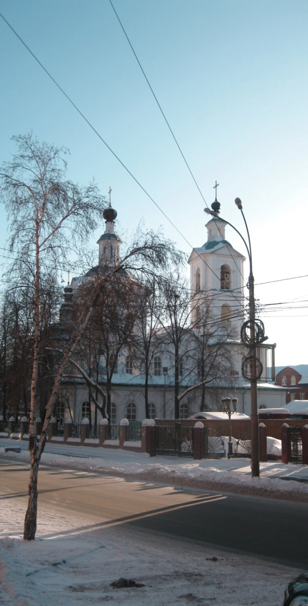 На переднем плане фотографии виднеется прихрамовая территория с дорогой и фонарным столбом, который указывает на современное городское окружение. Однако главным объектом, приковывающим внимание, является само церковное здание. Чётко просматривается центральный объём храма, увенчанный традиционным луковичным куполом, установленным на высокий световой барабан. Рядом возвышается многоярусная колокольня, завершённая шпилем, который устремляется в небо.