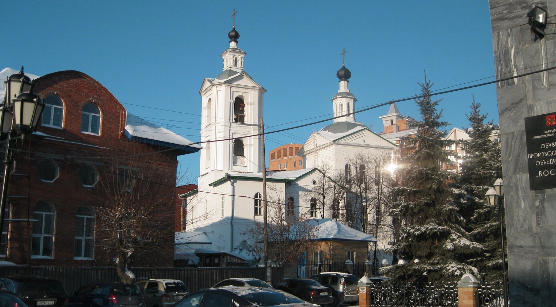 Главный фасад храма обращён к улице, где в момент съёмки припаркованы автомобили, что свидетельствует о расположении святой обители в историческом центре современного города. По левую руку от церкви видно кирпичное здание, а по правую — часть сооружения с сохранившейся советской вывеской «Обувное производственное объединение Восход». Это соседство символично отражает многовековую историю места, где духовная жизнь продолжается amidst городской суеты.