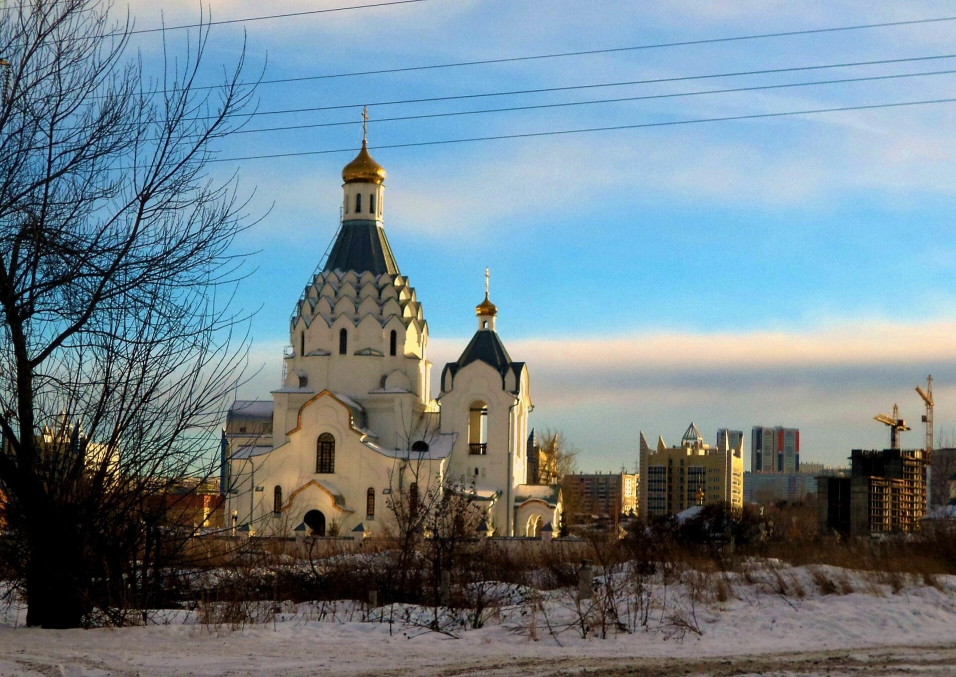 Небо на снимке чистое, голубое, с лёгкими белыми и сероватыми облаками. Сквозь ветви протянулись провода линий электропередачи, что добавляет кадру жизненной достоверности. Отсутствие людей на переднем плане позволяет сосредоточить внимание на красоте храма и окружающего зимнего пейзажа, передающего тихую благоговейную атмосферу.