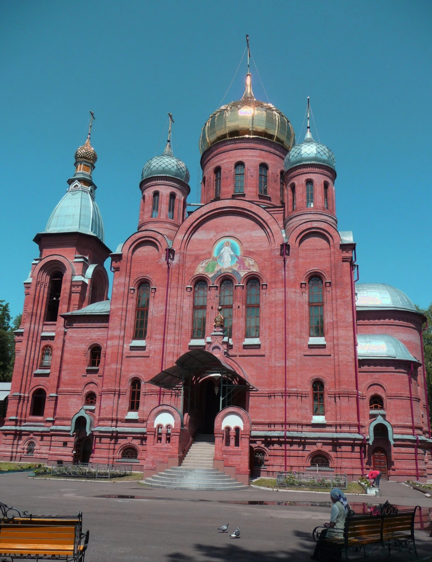 Перед собором раскинулась благоустроенная территория с аккуратными дорожками, ведущими ко святому входу, и скамьями для отдыха прихожан и паломников. В солнечный день, запечатлённый на снимке, игра света и тени подчёркивает монументальность и одновременно устремлённость храма ввысь, к небесам. На переднем плане фотографии виден человек, отдыхающий на скамье, и голуби, что придаёт кадру особую живость и миролюбие.