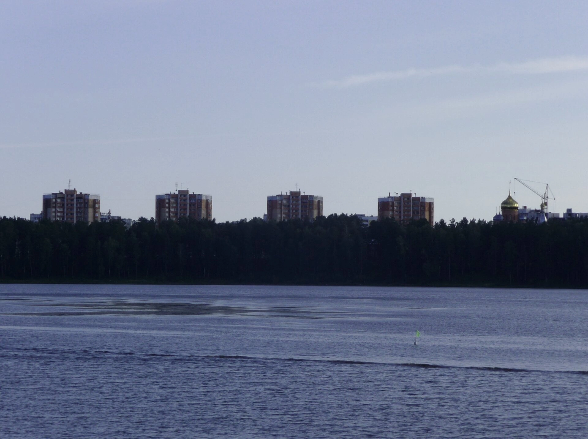На представленной фотографии запечатлён живописный вид, открывающийся с акватории Кантатского водохранилища в городе Железногорске Красноярского края. На переднем плане изображена спокойная водная гладь, отражающая свет неба и создающая атмосферу благости и умиротворения. Водоём, являющийся важным элементом городского ландшафта, служит естественным обрамлением для всего ансамбля.
