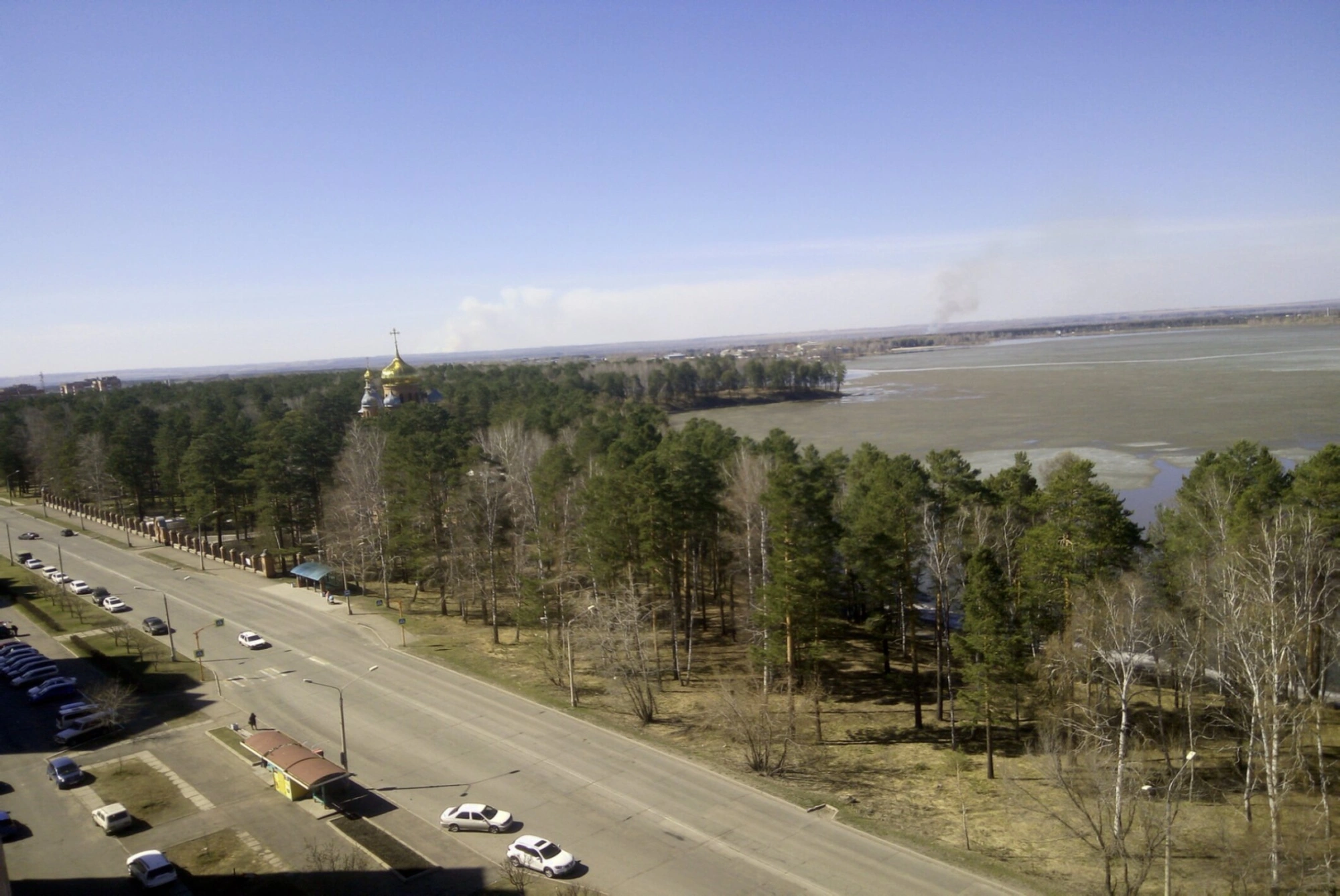 Перед храмом проходит городская дорога, вдоль которой выстроились оголённые лиственные и вечнозелёные хвойные деревья. Полоса зимнего леса отделяет городскую застройку от заснеженных берегов водохранилища Кантат, чьи ледяные воды уходят к линии горизонта. Водная гладь частично скована первым льдом, что указывает на позднюю осень или начало зимы — время суровой сибирской красоты.