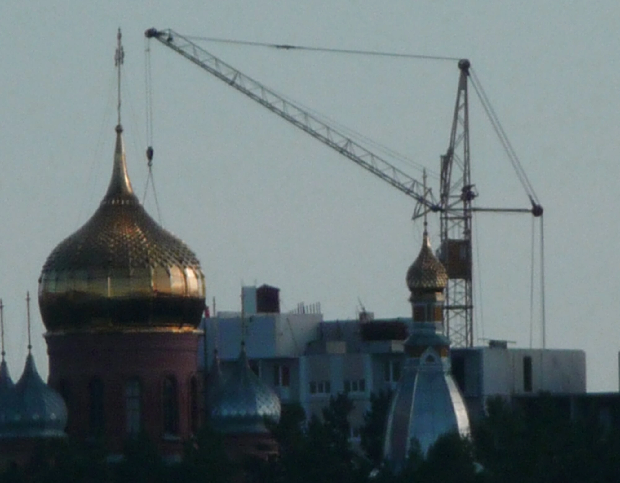 На заднем плане снимка виден строительный кран, что свидетельствует о проведении масштабных реставрационных или строительных работ на территории храмового комплекса. Это подчёркивает непрерывный процесс заботы и сохранения духовного наследия, которое имеет огромное значение для православной общины Сибири.