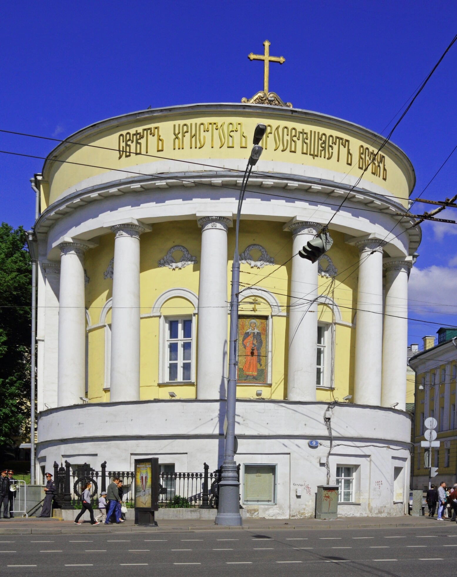 Фотография сделана в ясный день: на голубом небе видны лёгкие белые облака. Здание храма, окрашенное в светлые тона, контрастирует с зелёной листвой деревьев слева от него. На переднем плане видна асфальтированная проезжая часть, а вдоль тротуара и металлической ограды движутся пешеходы. Над улицей протянуты многочисленные электрические провода, что подчёркивает городской контекст. На заднем плане просматриваются другие городские постройки, характерные для исторической застройки центра Москвы.