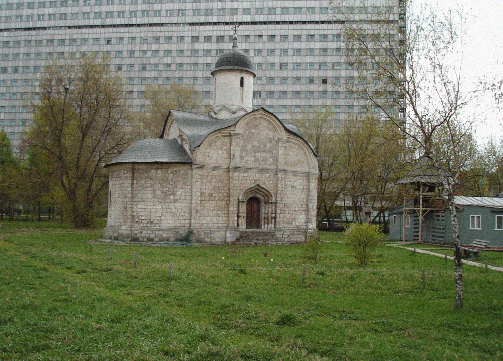 На фотографии запечатлён старинный православный храм во имя святого мученика Трифона, что в Напрудной слободе города Москвы. Это один из древнейших храмов столицы, уникальный памятник церковной архитектуры, чьи стены помнят многие века русской истории. Каменный храм, увенчанный скромным куполом с воздвигнутым на нём крестом, представляет собой образец традиционного древнерусского зодчества.