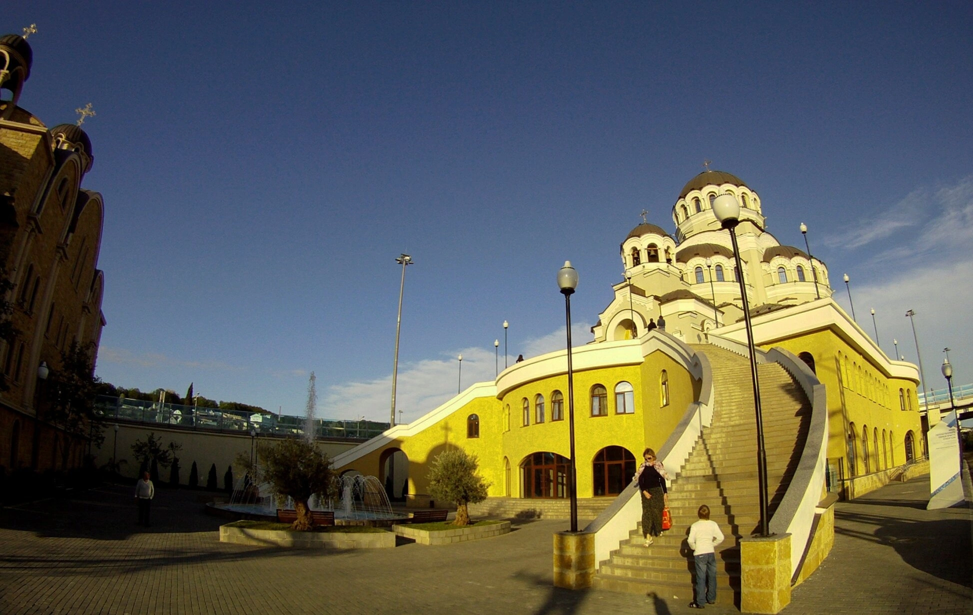 На фотографии запечатлён храм в честь Нерукотворного Образа Христа Спасителя, расположенный в Имеретинской низменности города Сочи. Этот современный православный храм был возведён на месте уникальной археологической находки. В 2010 году в ходе подготовительных работ к Олимпиаде-2014 были обнаружены руины древнего византийского храма, датируемого IX веком от Рождества Христова.