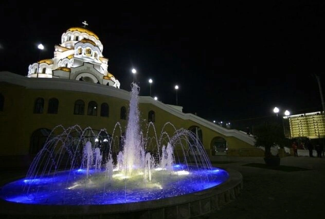 Перед белоснежными стенами храма, устремлёнными ввысь, расположен светящийся фонтан, чьи струи, переливаясь в ночном освещении, создают живописный и торжественный образ. Этот архитектурно-ландшафтный ансамбль превращает территорию вокруг храма в место особой благодати и притяжения для паломников и гостей города.