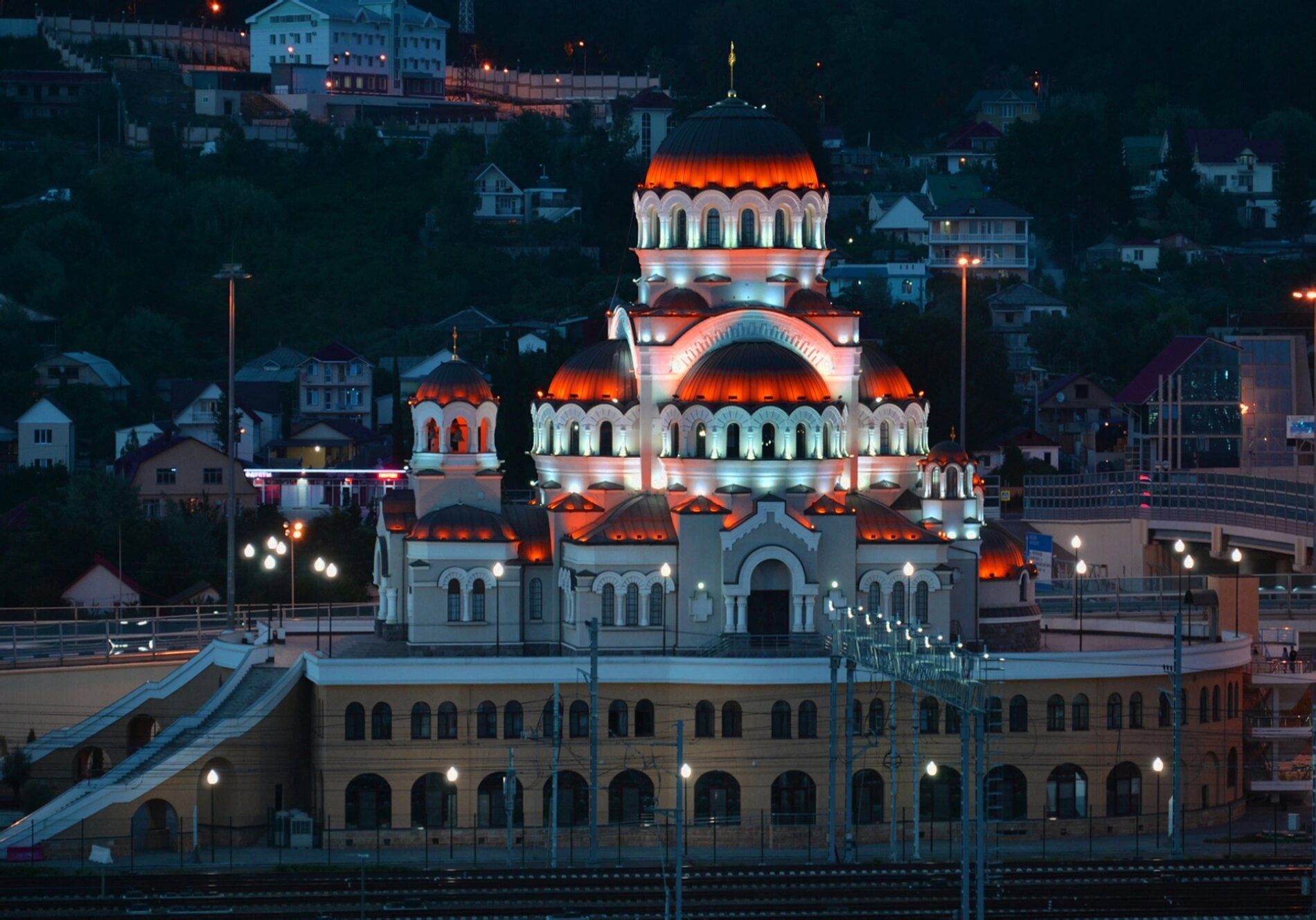 На заднем плане виднеются огни жилых построек, расположенных на склонах окружающих холмов, что подчёркивает гармоничное вписывание храма в городской ландшафт. Присутствие на переднем плане элементов инфраструктуры, включая железнодорожные пути, символизирует связь духовной жизни с повседневным бытием человека. Данный храм является одним из значимых православных центров на черноморском побережье России, привлекая паломников и туристов своим архитектурным обликом и благодатной атмосферой.